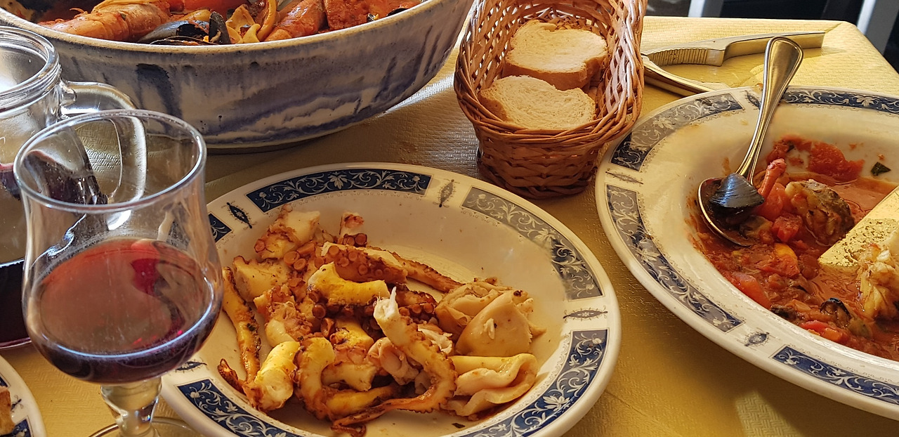 주문하면 커다란 그릇을 먼저 가져다 놓는다. 한참을 기다리게 한 후, 도기 그릇에 담긴 해산물 요리를 가지고 나와 큰 그릇에 통째로 부어 준다. 가재 한 마리, 왕새우, 문어, 오징어, 흰살생선, 홍합이 토마토소스에 푹 잠겨 있다. 내가 상상해 온, 지중해식 해산물 요리의 전형적인 모습이었다.