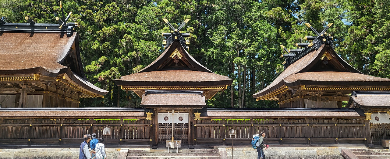 숲이 끝나는 지점에서 도리이가 모습을 드러냈다. 계단을 오르자, 구마노혼구타이샤가 나타난다. 여러 순례길이 교차하는 이곳은 전통적으로 구마노 참배의 첫 목적지였다. 못을 쓰지 않고 목재를 맞물려 지은 건축, 편백나무껍질로 덮은 곡선 지붕이 인상 깊다.