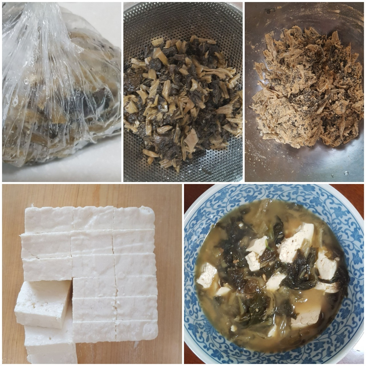 추운 데서 오래 기다린 시래기는 얼음으로 덮여 있었다. 우선은 찬물에 담가 해동한다. 와, 괜찮아졌네! 금방 삶아낸 것과 다르지 않아 일단은 안심이다. 콩가루에 버무려 시래기 국을 끓이면 맛있다던데... 들은 풍월대로 콩가루로 조물주물 무친다. 옆지기가 만든 된장 국물이 부글부글 끓는다. 콩가루 옷을 입은 시래기 투척, 두부도 송송 썰어 넣는다.
