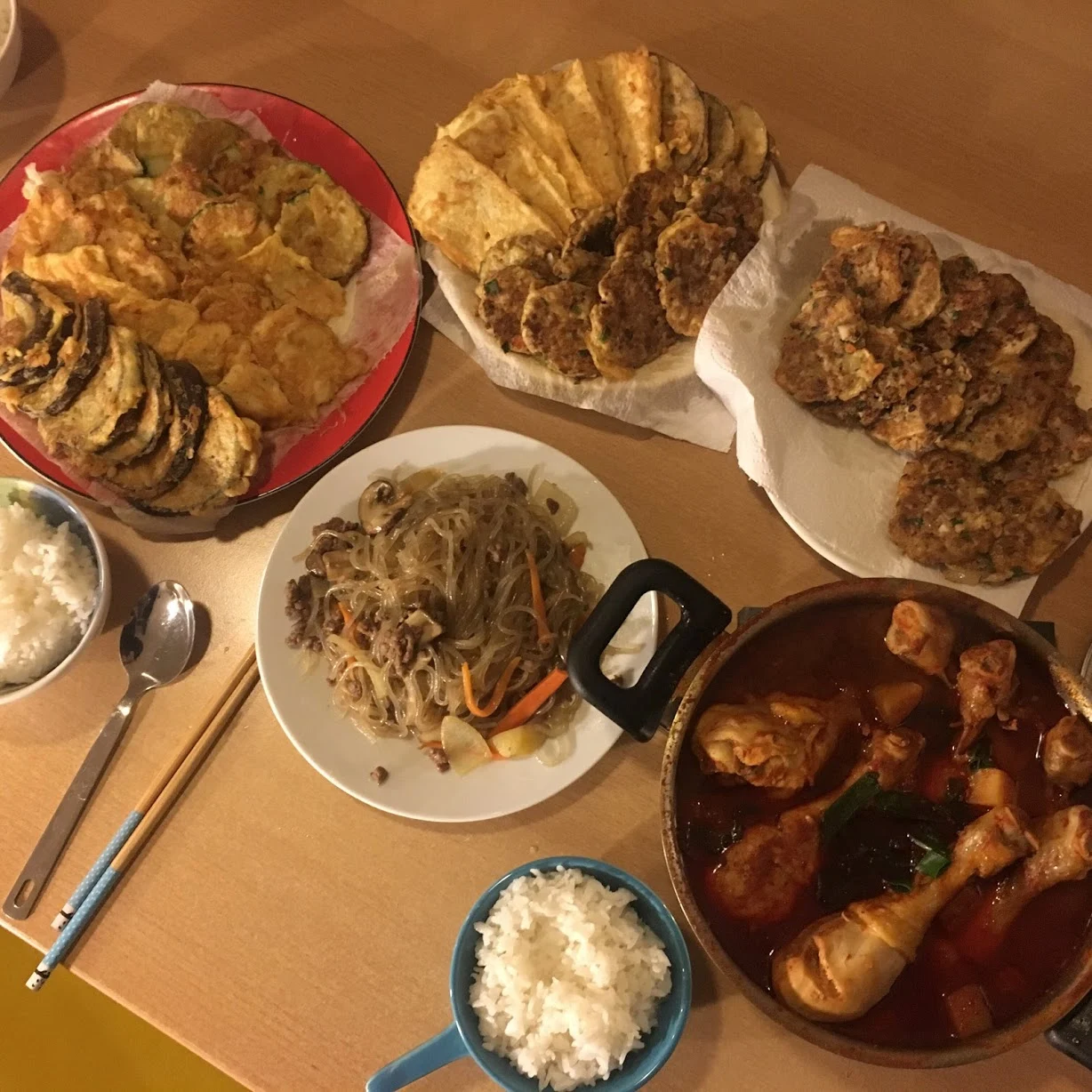 전은 3명이 한 조가 되어 밀가루 – 계란 – 굽기 기술을 선보였다. 나머지 친구들은 동그랑땡 반죽에 양념을 조물락조물락 섞었다. 그렇게 여섯 사람 열두 손의 사투가 두 시간 이어지고 한 상이 완성되었다. 방을 치우고 의자를 동원해서 6명이 둘러앉았다. 닭볶음탕은 정신이 없어 간도 보지 못했고 잡채는 미리 해서 식어있었다. 우리는 하이네켄 맥주를 하나씩 따서 마셨다. 모든 요리는 우리의 노동의 결과물이어서 무척 맛있게 느껴졌다. 실제로도 닭볶음탕은 황금레시피보다 20분 더 끓인 탓에 진하게 우러나서 식당 요리 같았다. 갈비찜은 아니었지만 행복했다.