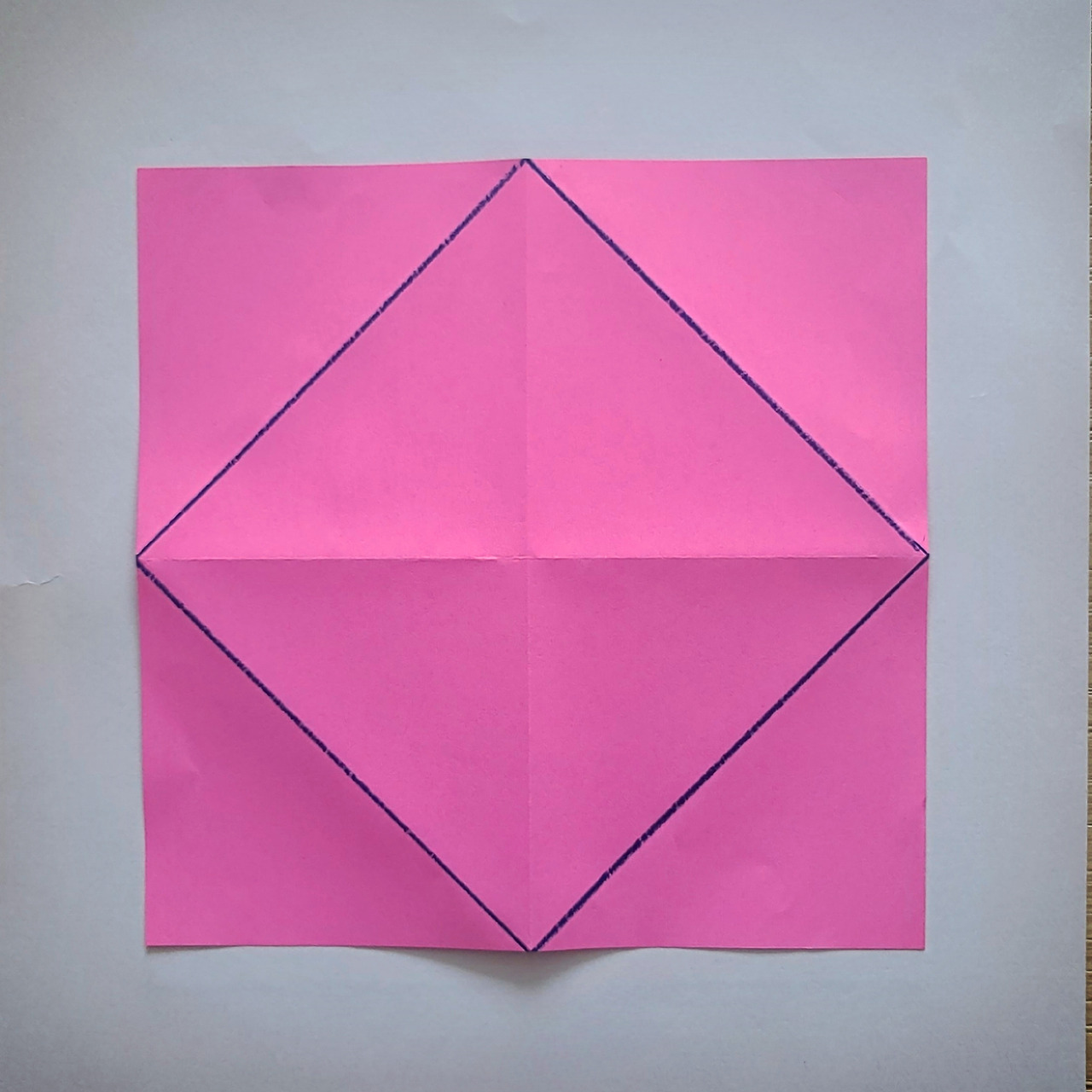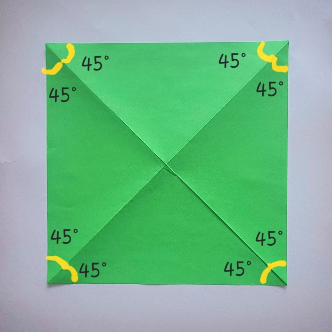 색종이는 처음에 작은 정사각형 4개로 4등분 됐습니다. 그리고 모서리를 중심을 향해 접을 때 '대각선'이 만들어졌죠. 이 대각선이 작은 정사각형을 반으로 나누니까 색종이는 삼각형 8개로 8등분 됐어요. 전체 색종이를 반으로 만들려면 삼각형 4개만 있으면 되죠.