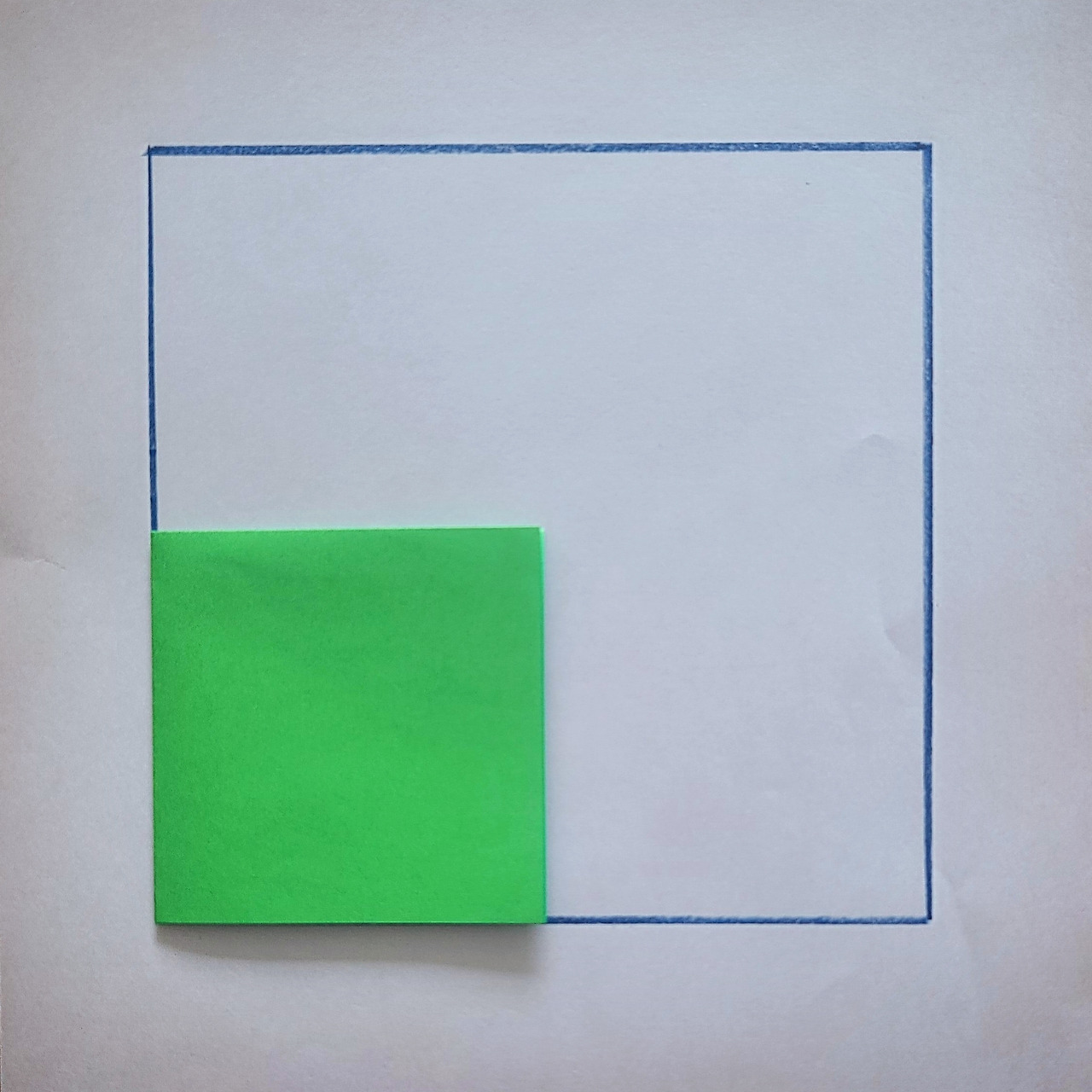 여러분도 아시다시피 색종이는 정사각형입니다.'정사각형'이란 네 변의 길이가 같고, 네 각이 직각인 사각형을 말합니다. 이 색종이의 정확히 절반 넓이 되는 정사각형을 만들어 보세요. 단 눈금자는 사용하지 않기로 해요.