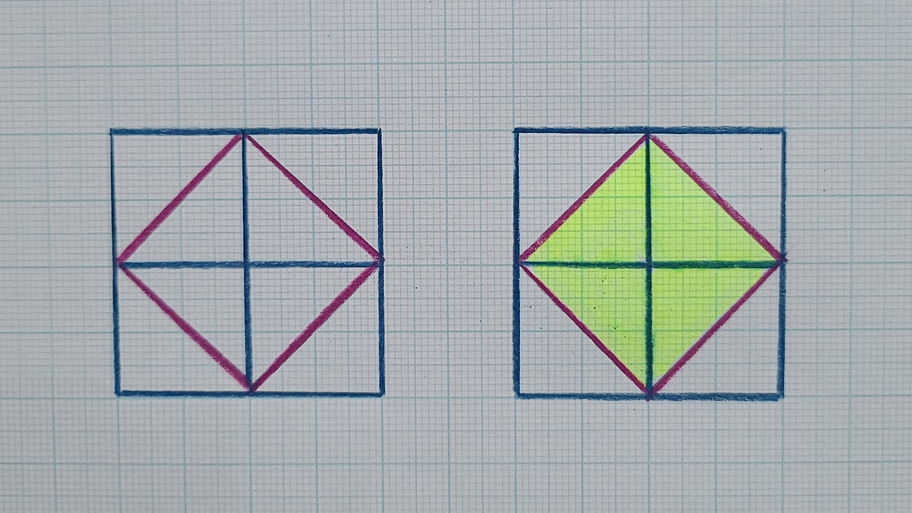 앞서 우리는 삼각형 두개로 정사각형을 만들었는데요. 절반 넓이의 정사각형을 만드는 방법은 또 있습니다. 이번에도 '대각선'을 잘 이용해 보세요. 이런 문제는 종이접기 마니아들에게 무척 유리해요. 색종이를 만지다 보면 손가락 센서가 작동됩니다. 어쩌면 손이 뇌보다 빠를지도몰라요. 함께 접어보겠습니다.