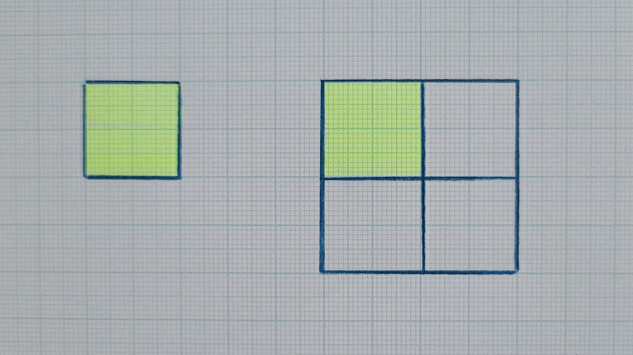 정사각형은 맞지만 넓이가 반(½)이 아니라, 반의 반(¼)이 됐어요. 우리가 원한 건 이게 아니잖아요. 우리는 절반 넓이의 정사각형을 만들어야 합니다.