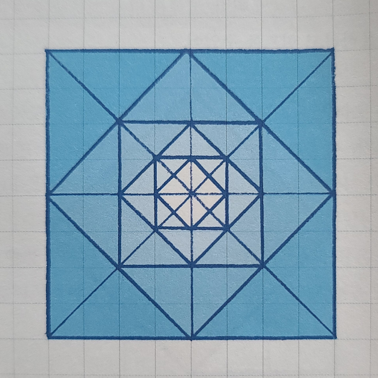 이렇게 삼각형 4개로 정사각형을 만들었어요. 신기하게도 방석접기를 한 번 할 때마다 넓이는 계속 절반씩 줄어들어요. 색종이를 펼치면 아래 그림처럼 정사각형이 반복됩니다.가운데를 가만히 보고 있으면 속으로 빨려 들어가는 느낌이들어요.