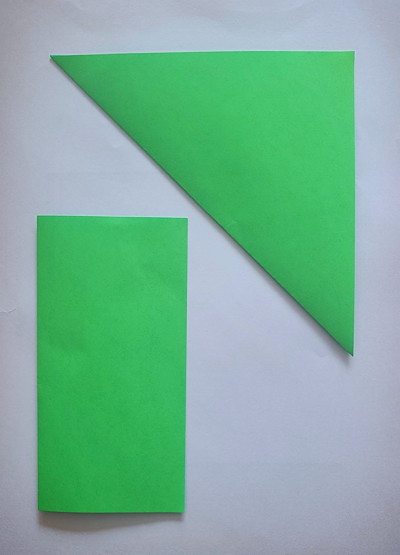 대각선이 정사각형을 딱 절반으로 나눠주니까요.아까 반으로 접어서 만든 직사각형과 방금 반으로 접어서 만든 이 삼각형의 넓이는 같습니다.우리가 만들어야 할 절반 정사각형도 이 둘과 넓이가 같아야 합니다.