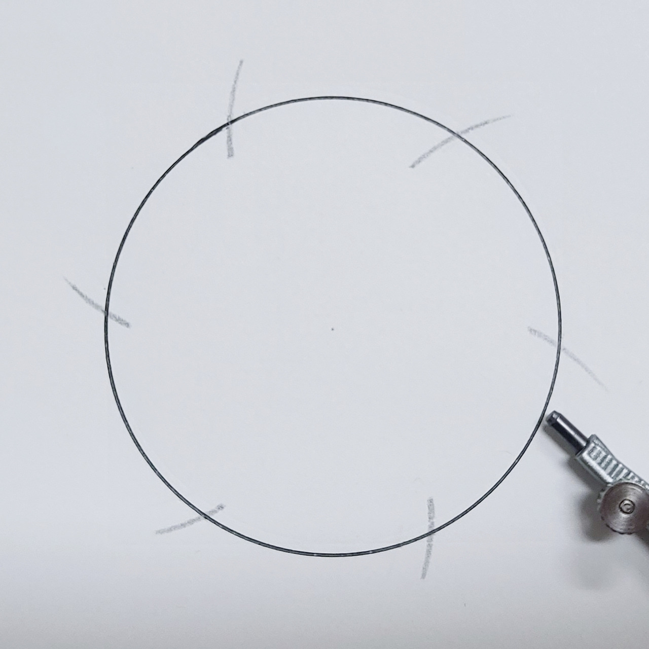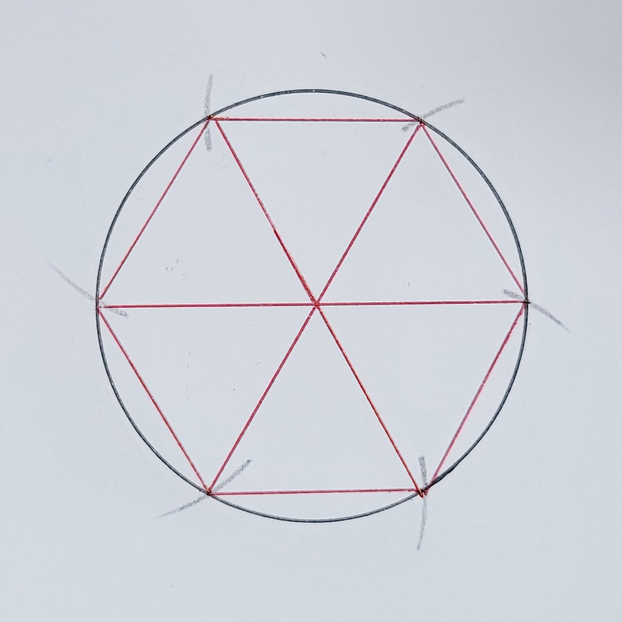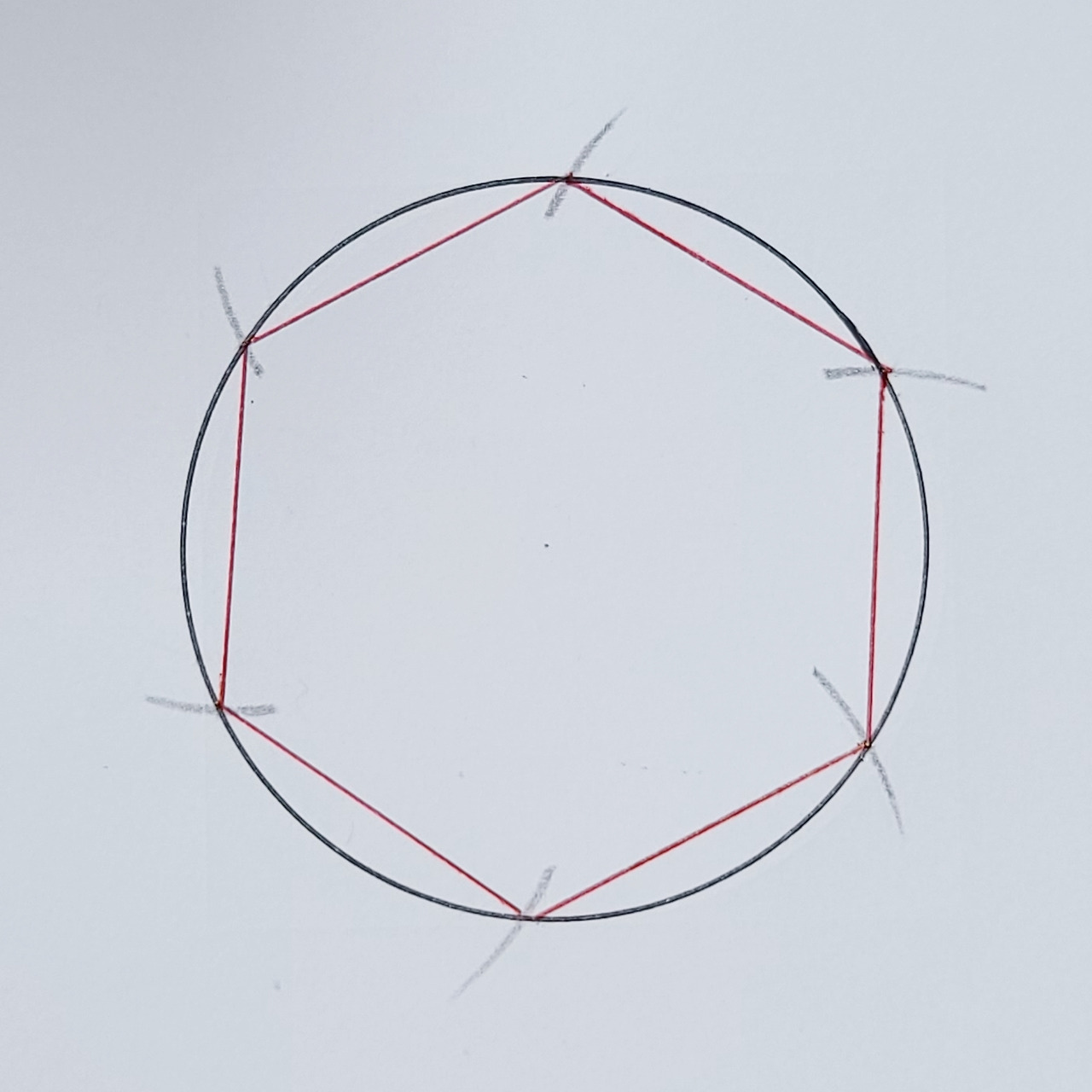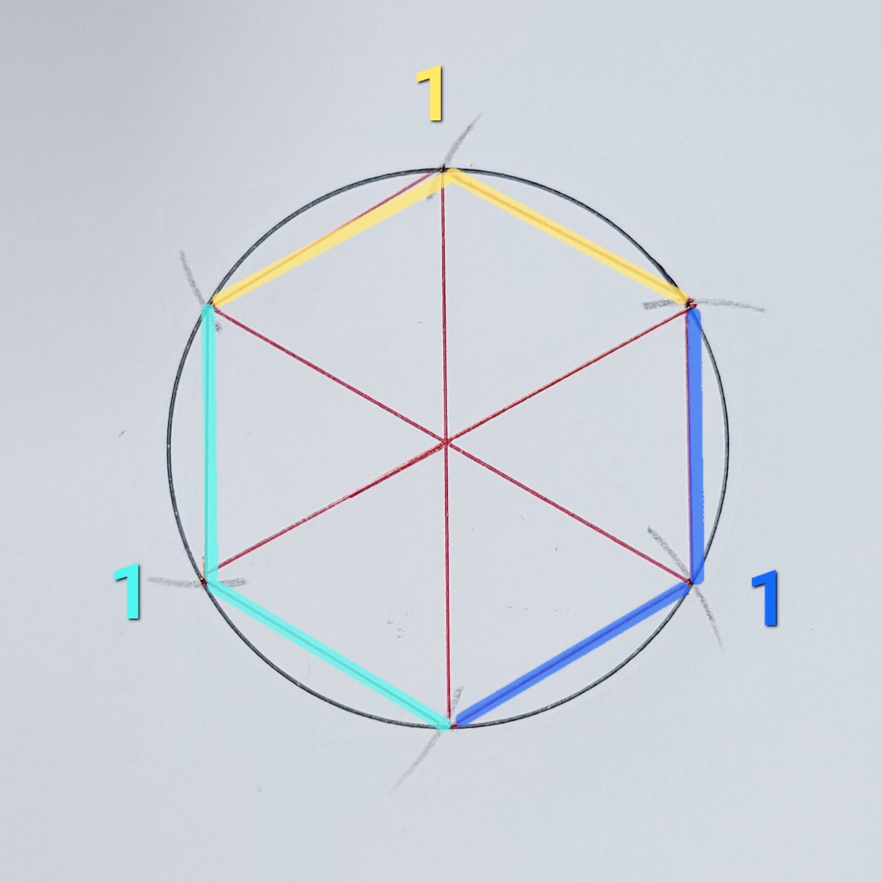 이번에는 지름이 1인 원 안에 정육각형을 그려볼게요.어떻게 그리냐면, 원의 반지름의 길이만큼 컴퍼스를 벌려줍니다. 컴퍼스를 이용해 원의 둘레에 점을 찍으면 정확히 6개가 찍힙니다. 이 점 6개를 연결해 주니 원 안에 정육각형이 생겼습니다.