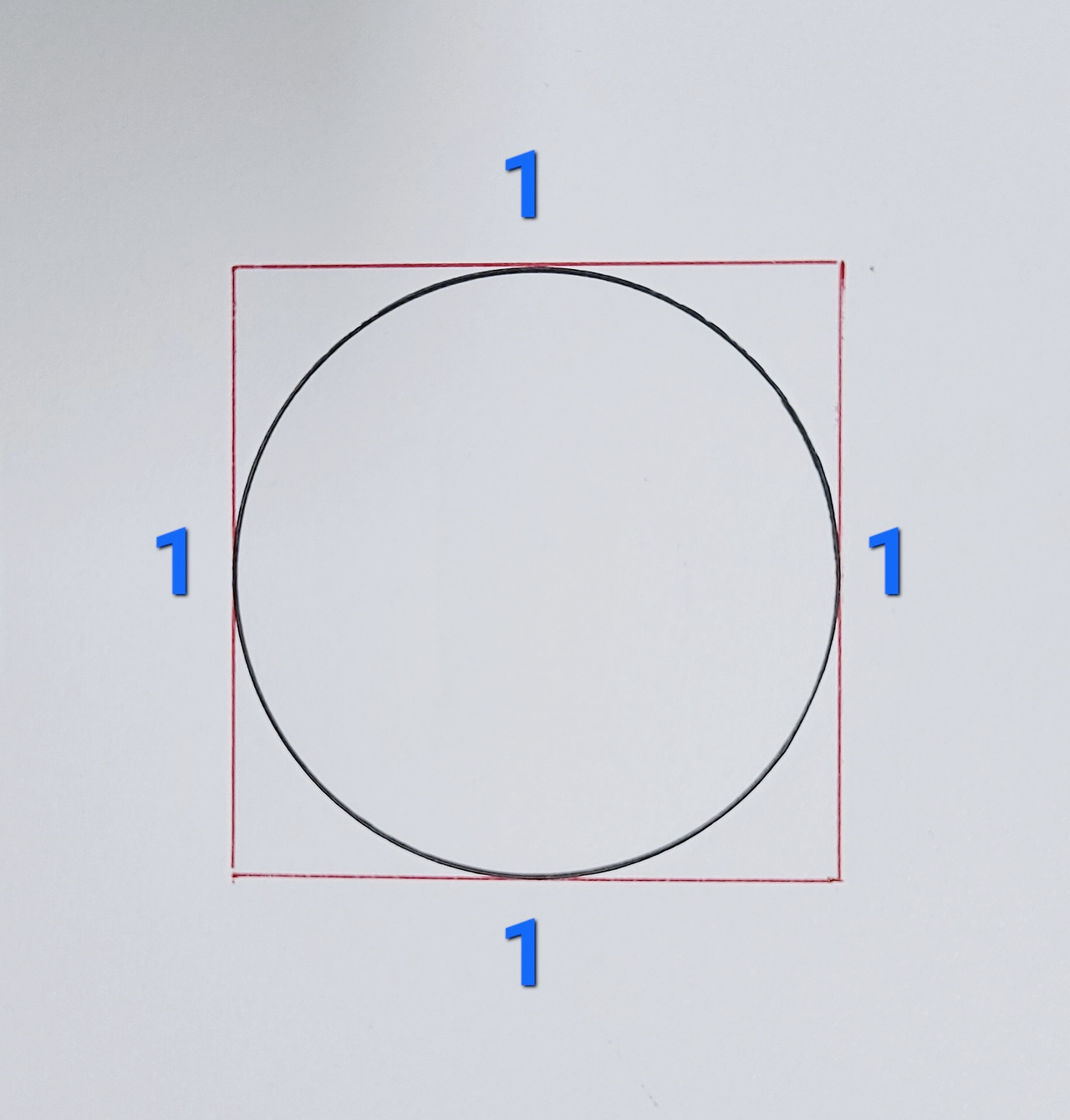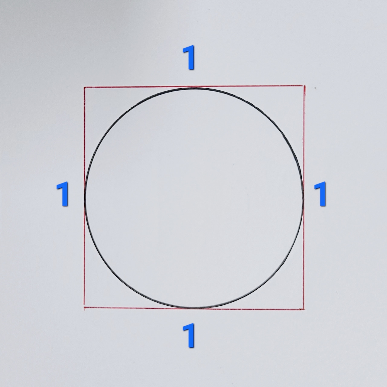 여기 지름이 1인 원이 있다고 칩시다. 원주율 계산이 쉽도록 원의 지름을 1로 정했어요. 지름이 1이면 원의 둘레가 곧 원주율이 되거든요. 자 이제 이 원을 둘러싼 정사각형을 그려보겠습니다.