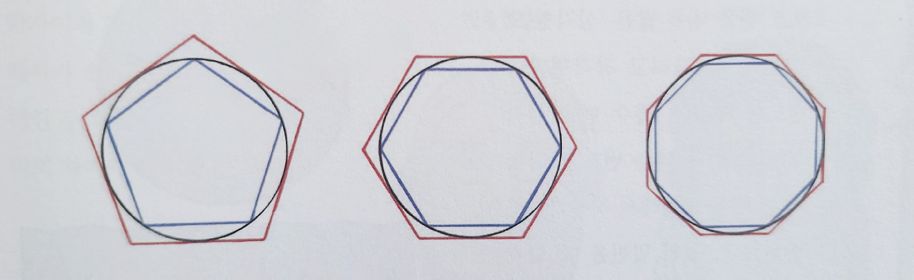 고대 그리스 수학자인 아르키메데스는 원의 안쪽과 바깥쪽에 다각형을 그려서 그 다각형의 둘레를 구했습니다. 그러면 원둘레는 그 둘 사이에 있을 거라고 생각한 거죠.