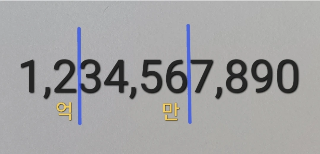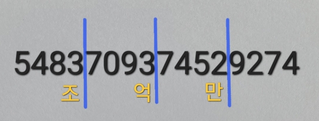 서양식과 동양식 수 읽기는 분명히 다릅니다. 3개씩 끊느냐, 4개씩 끊느냐 바로 그 차이예요. 리는 아래 그림처럼 네 자리마다 단위가 달라집니다.