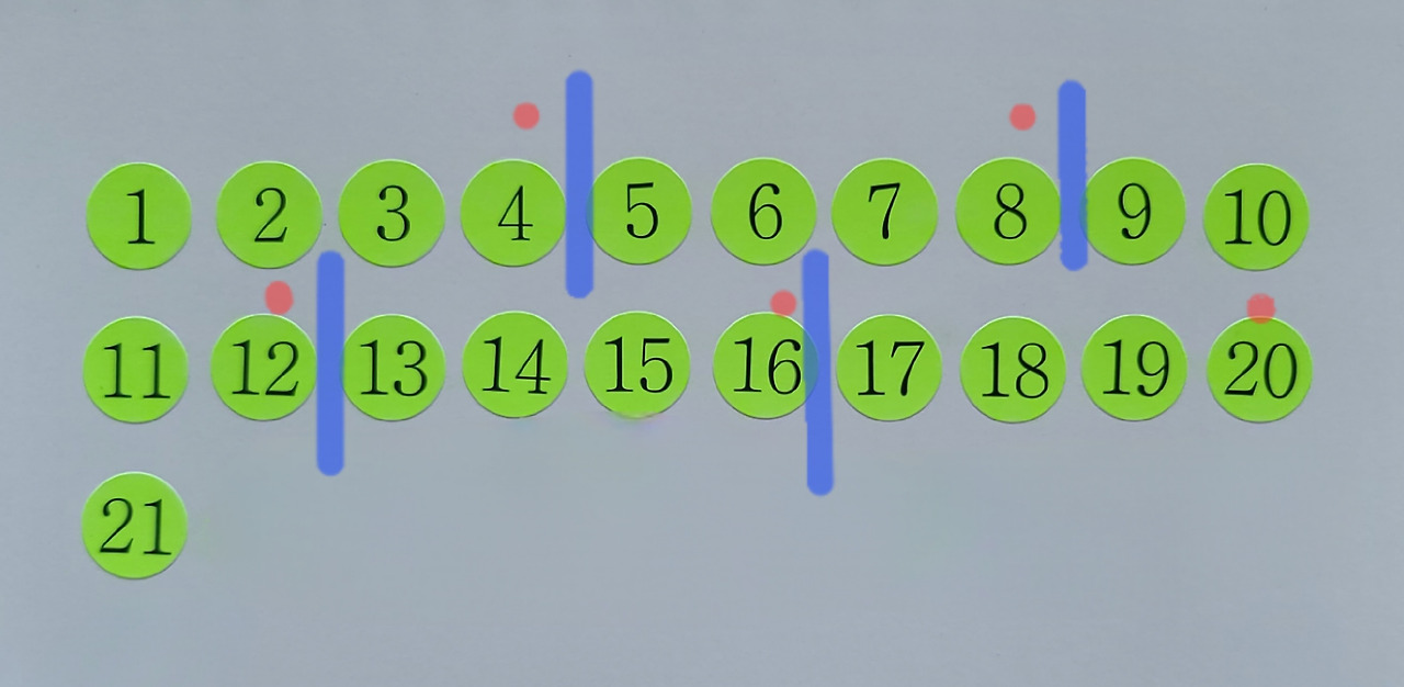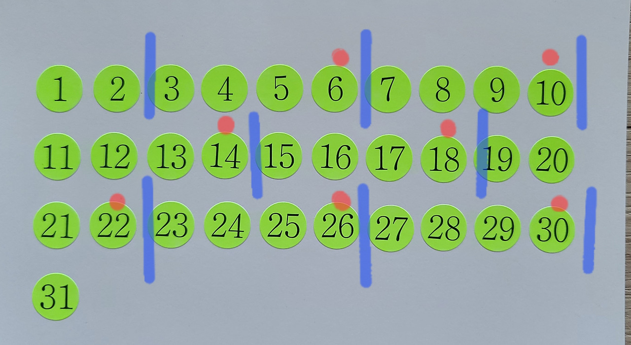 그런데 안타깝게도 상대가 (1,2)를 외치면 그땐 어떡하죠? 아직 포기하긴 일러요. 위의 그림에 빨간색으로 표시한 수를 내가 선점하면 됩니다. 6,10,14,18,22,26,30을 머릿속 팝업창에 띄어놓으세요. 어떻게든 이 수들 중 하나를 차지하면 그 후부터는 4개씩 유지할 수 있어요. 결국 내가 이깁니다.