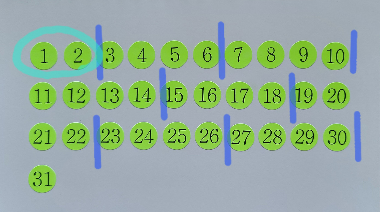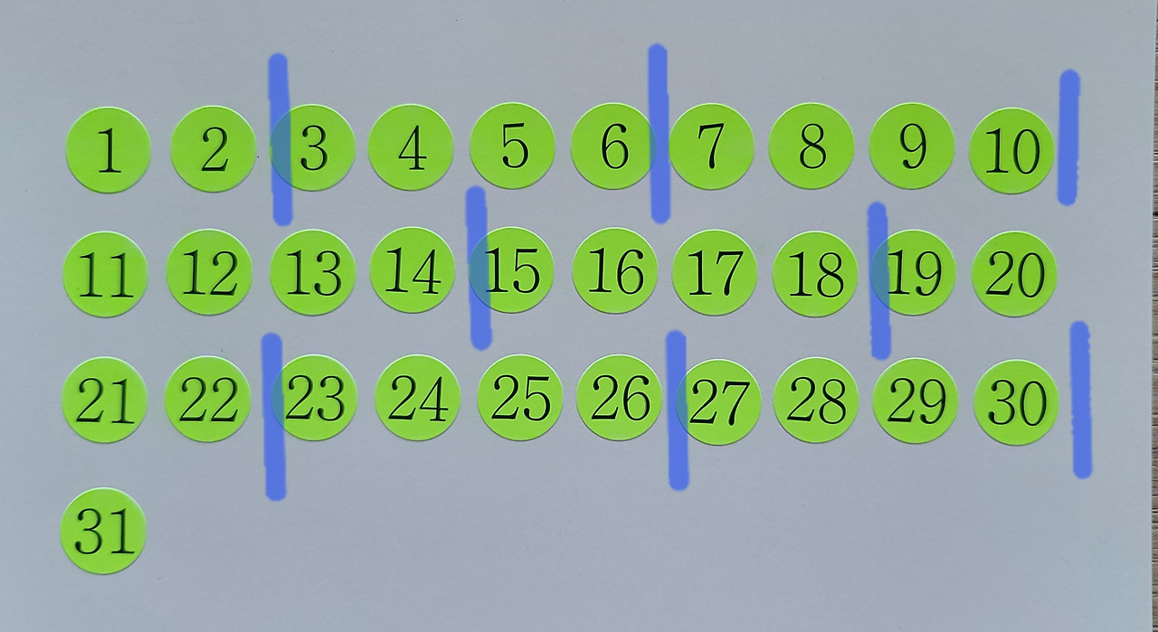 우선 수들을 펼쳐보겠습니다. 1부터 31까지입니다.