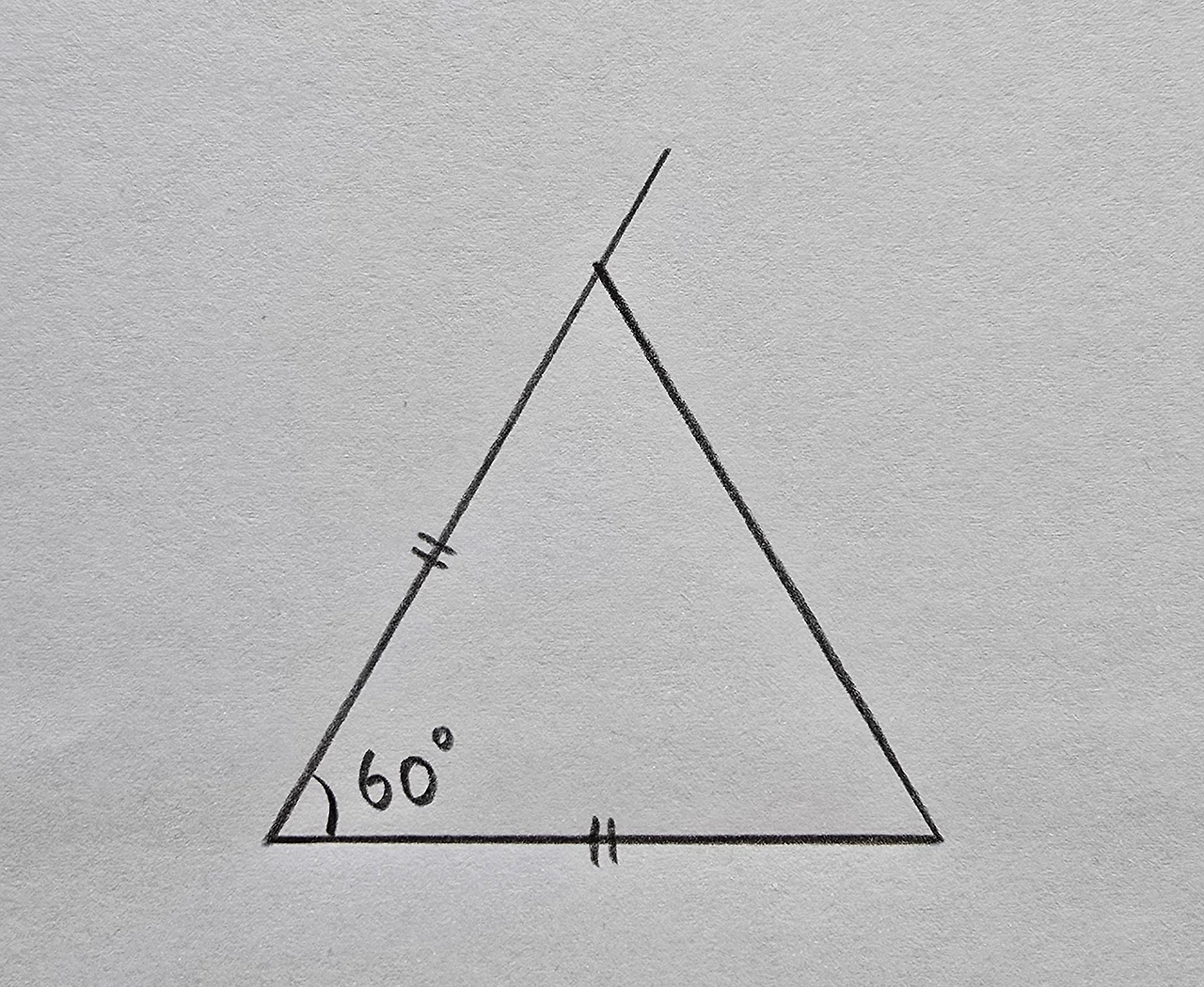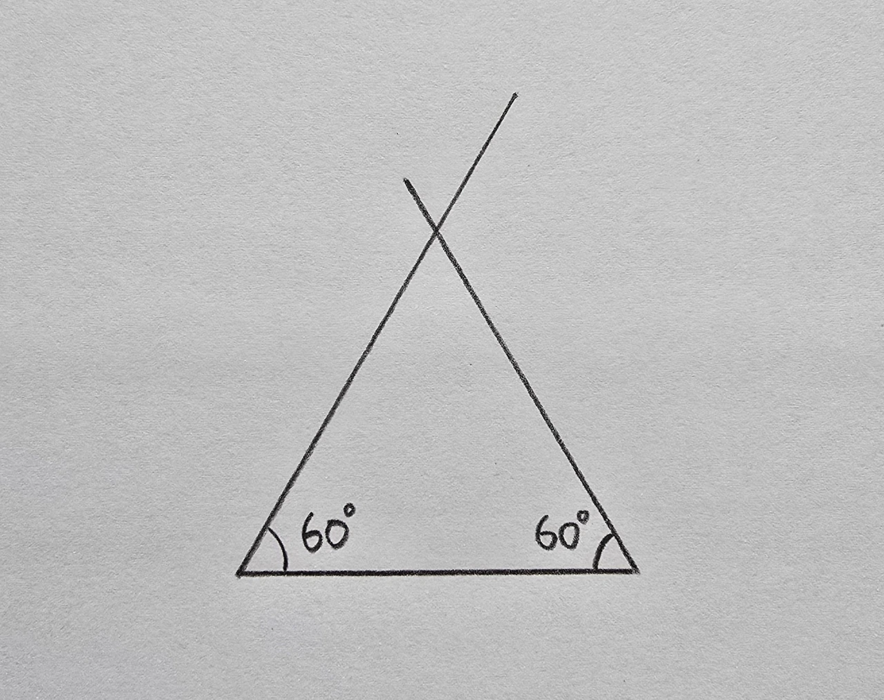 또는 주어진 선분의 한쪽 끝에서 60°인 각을 그린 후 자를 이용해 변의 길이가 같은 지점을 표시합니다. 이 점을 선분과 연결해도 정삼각형을 그릴 수 있어요.