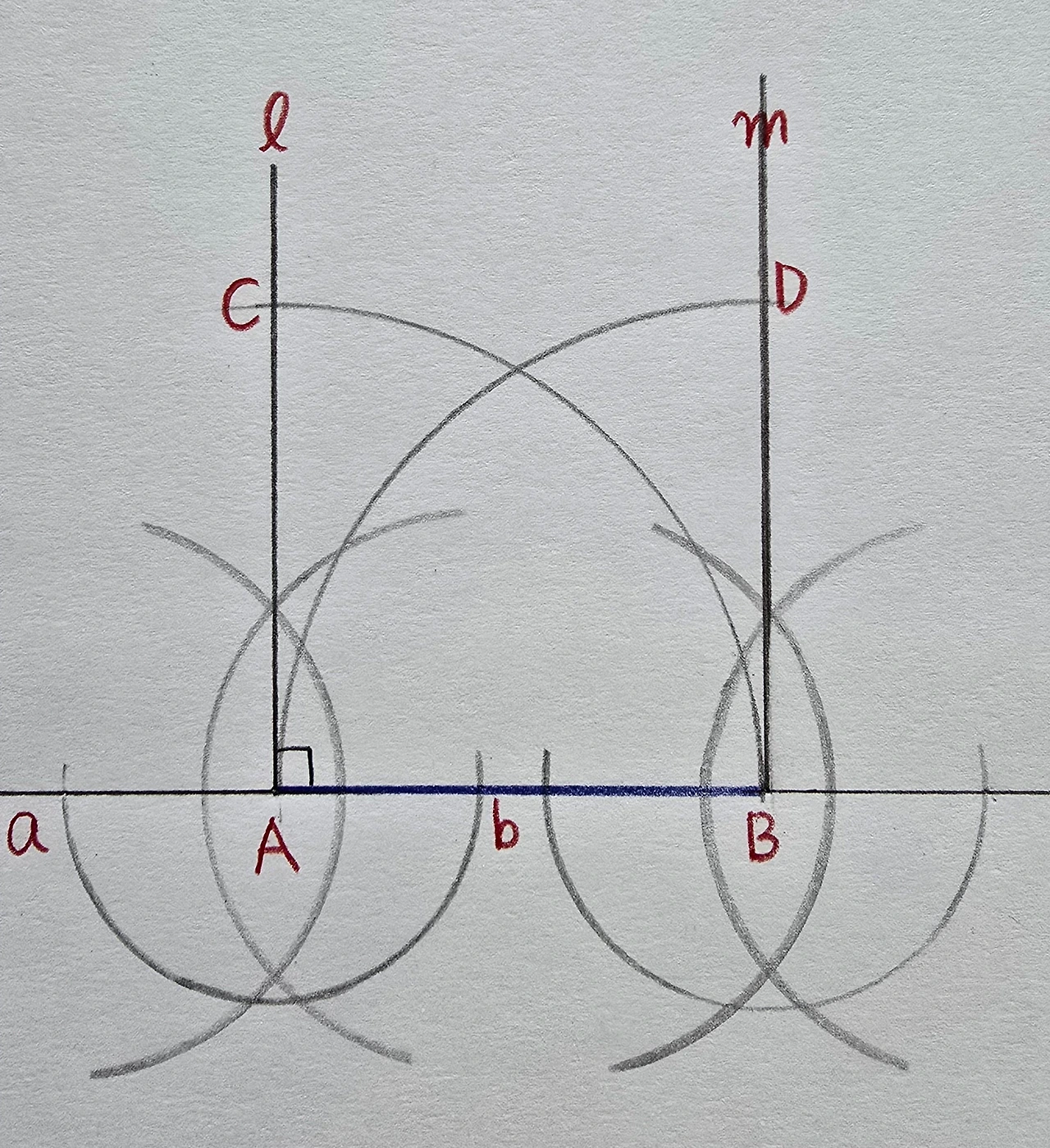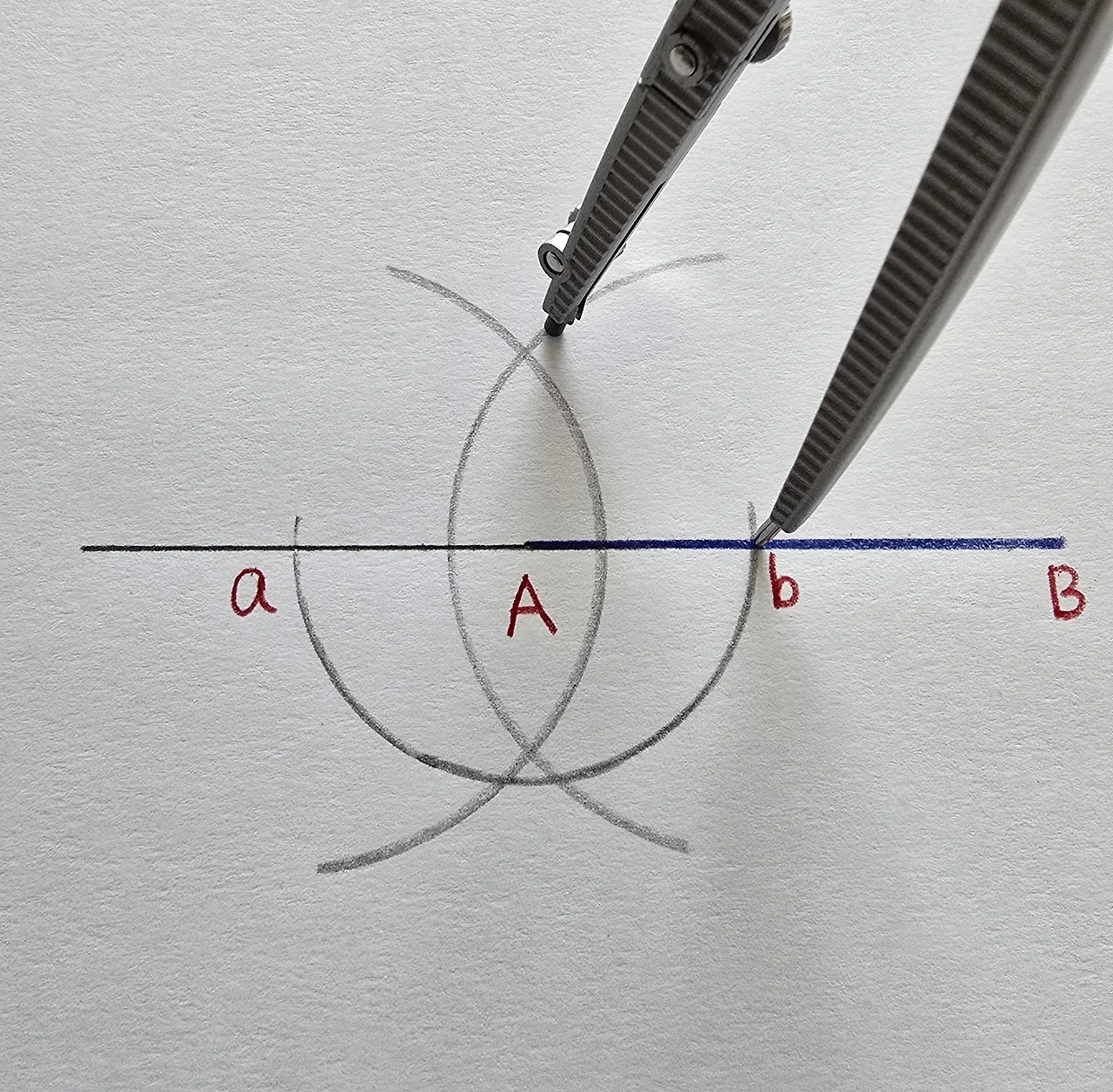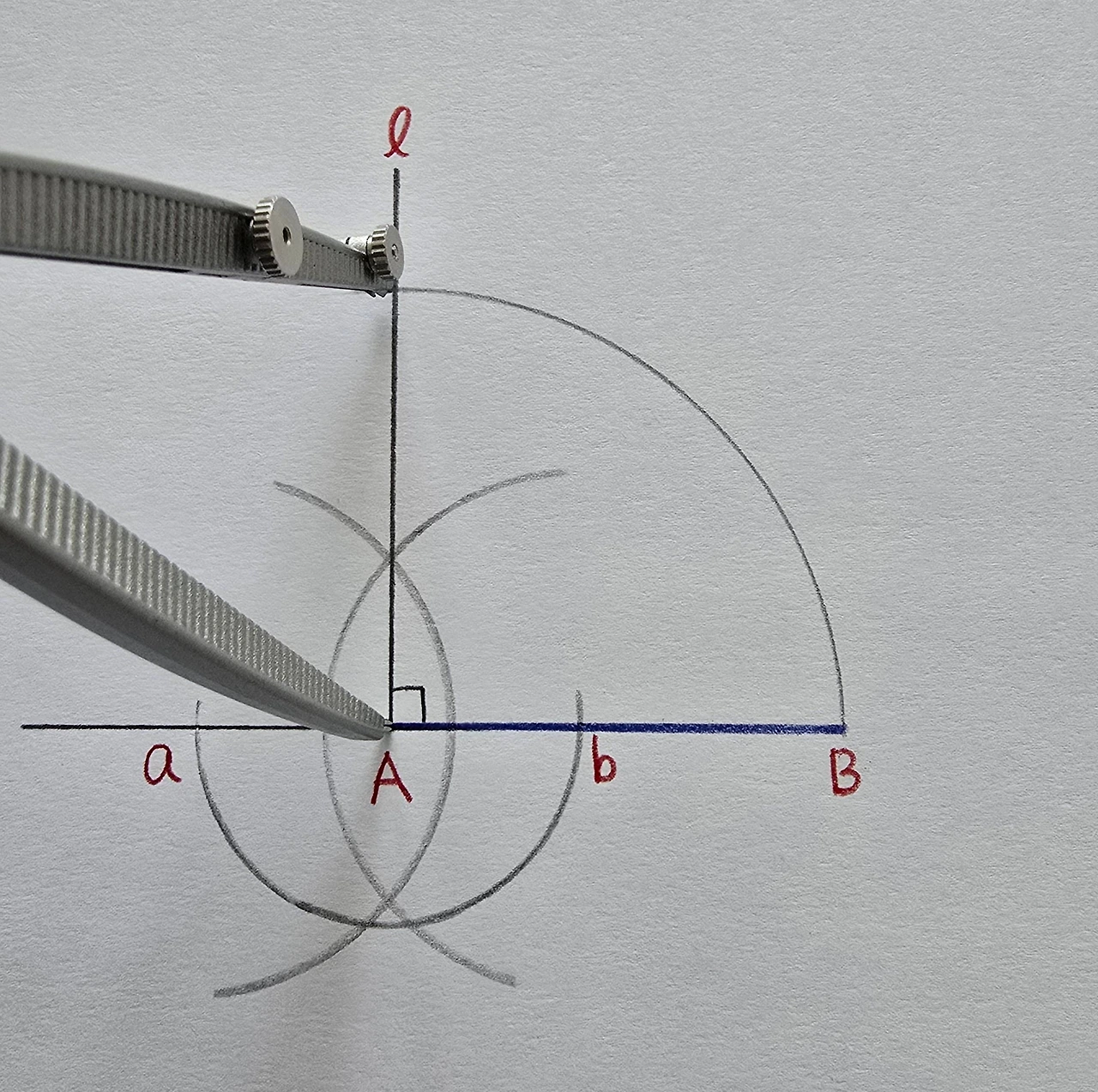 컴퍼스를 조금만 더 벌려서, 점 a와점 b를 중심으로 하는 호를 각각 그린 후, 교점을 점 A와 연결합니다.