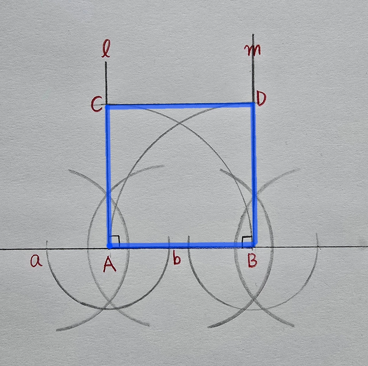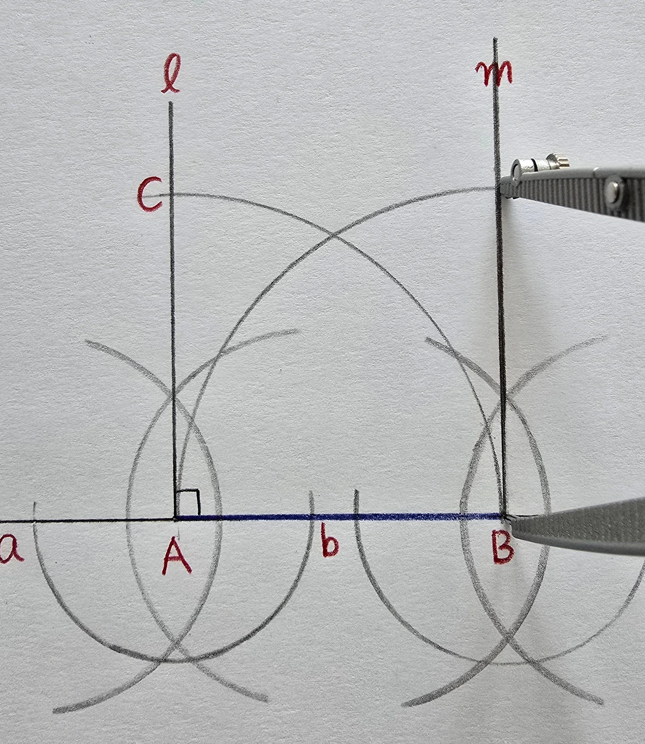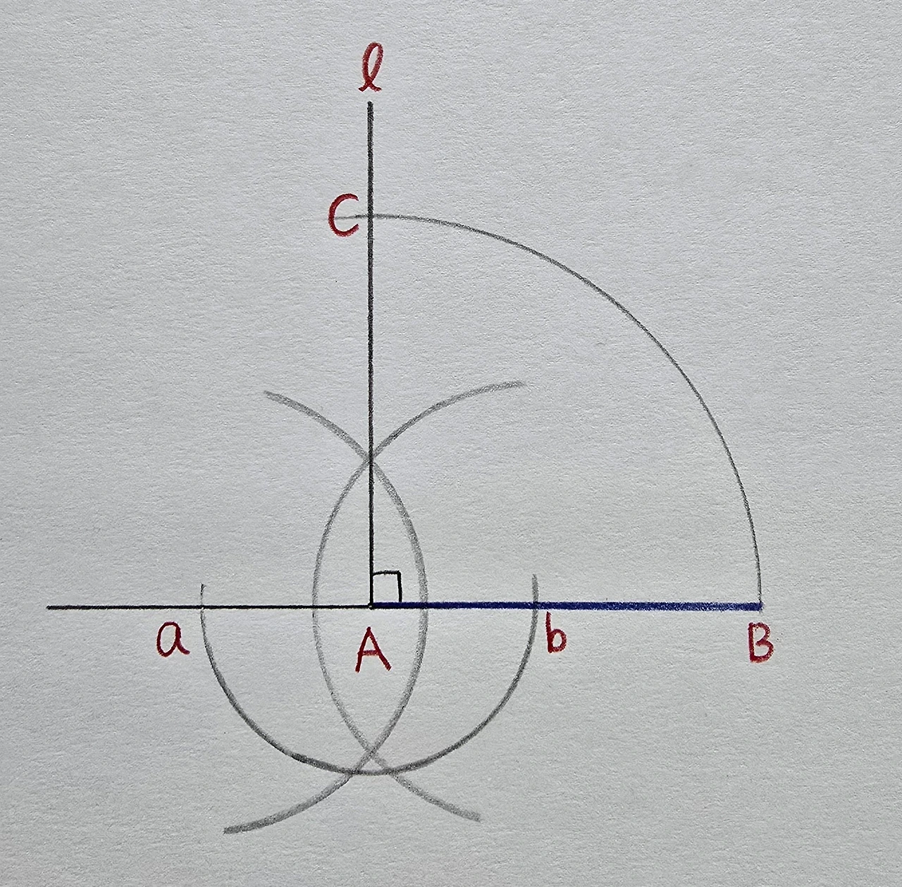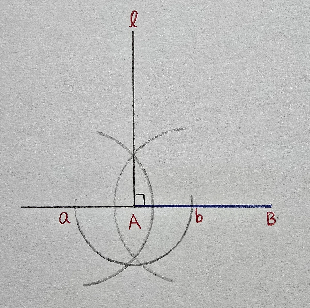 컴퍼스를 조금만 더 벌려서, 점 a와점 b를 중심으로 하는 호를 각각 그린 후, 교점을 점 A와 연결합니다.