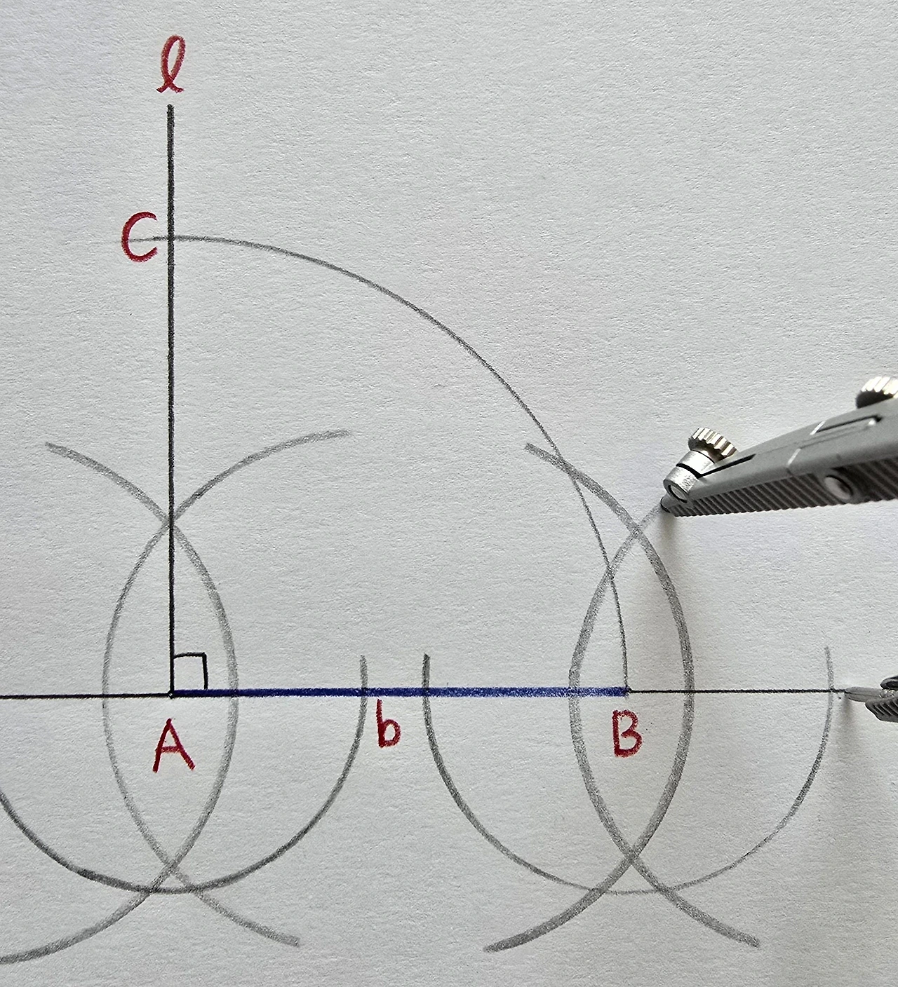 컴퍼스를 선분 AB만큼 벌린 후, 점 A를 중심으로 호를 그립니다. 직선 l과 호의 교점을 점 C라고 정합시다.