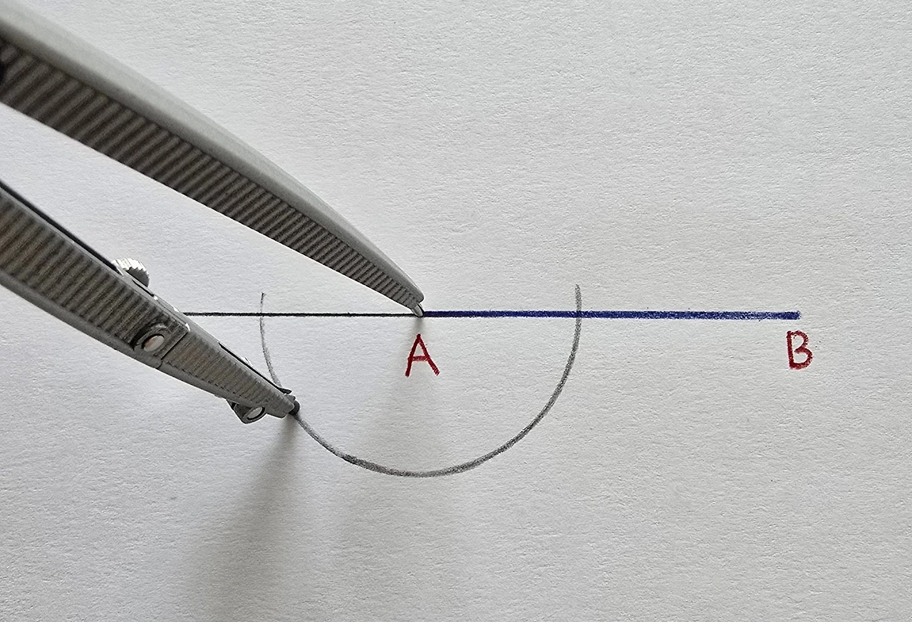 이제부턴 원 전체 대신 원의 일부인 호를 그릴게요. 점 A를 중심으로 호를 그려서 선분 AB와 만나는 지점을 표시합니다.