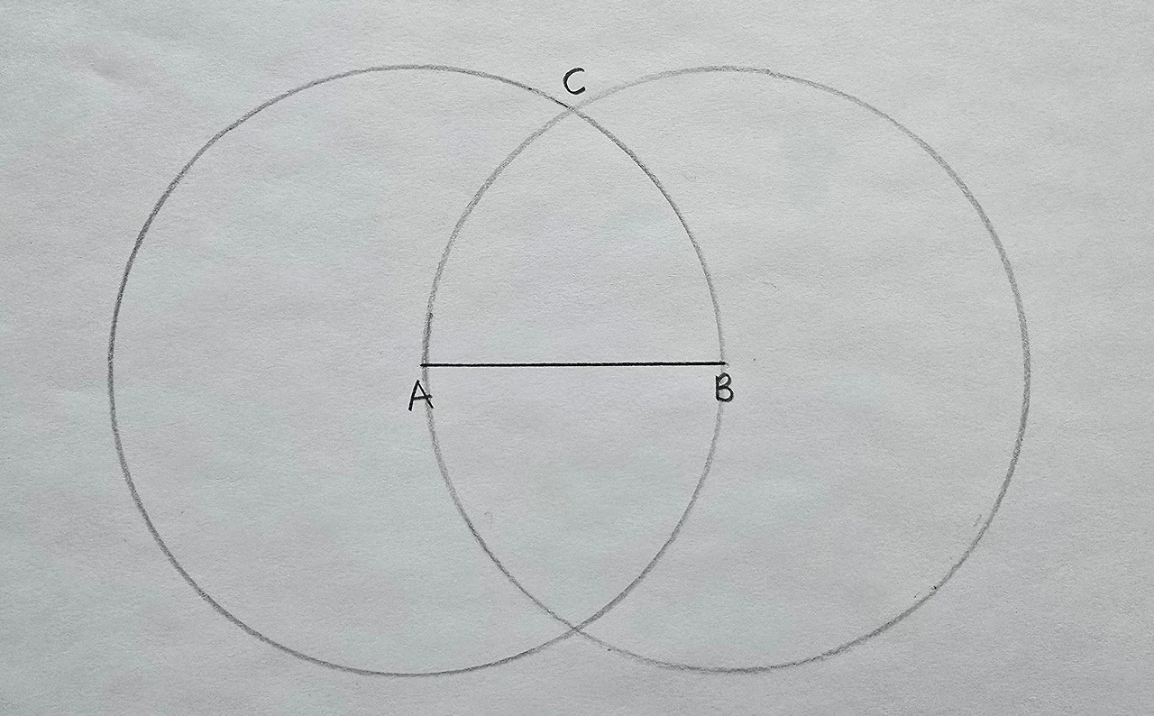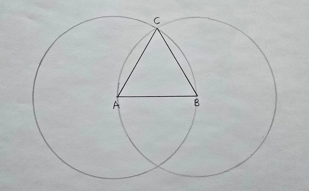 애초에 우리가 선분 AB를 반지름으로 해서 원을 그렸기에 당연해요. 세 변의 길이가 같으니 정삼각형이 확실합니다. 작도를 하다 보면 자연스레 도형에 대해 알게 됩니다.
