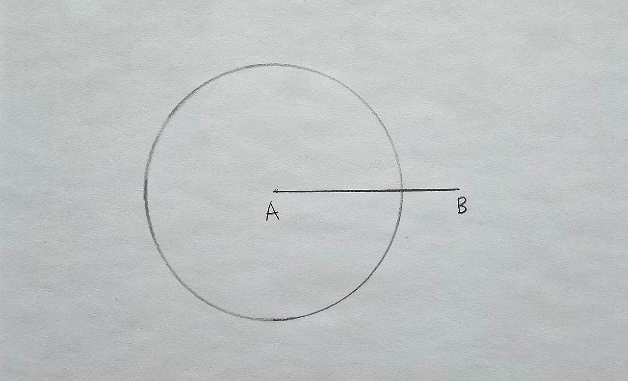 선분 AB와 90°를 이루는 선, 즉 선분 AB에 대한 수선을 그릴 겁니다. 먼저 점 A에 컴퍼스의 중심축 바늘을 두고 선분의 절반 이상으로 폭을 벌려 원을 그립니다.