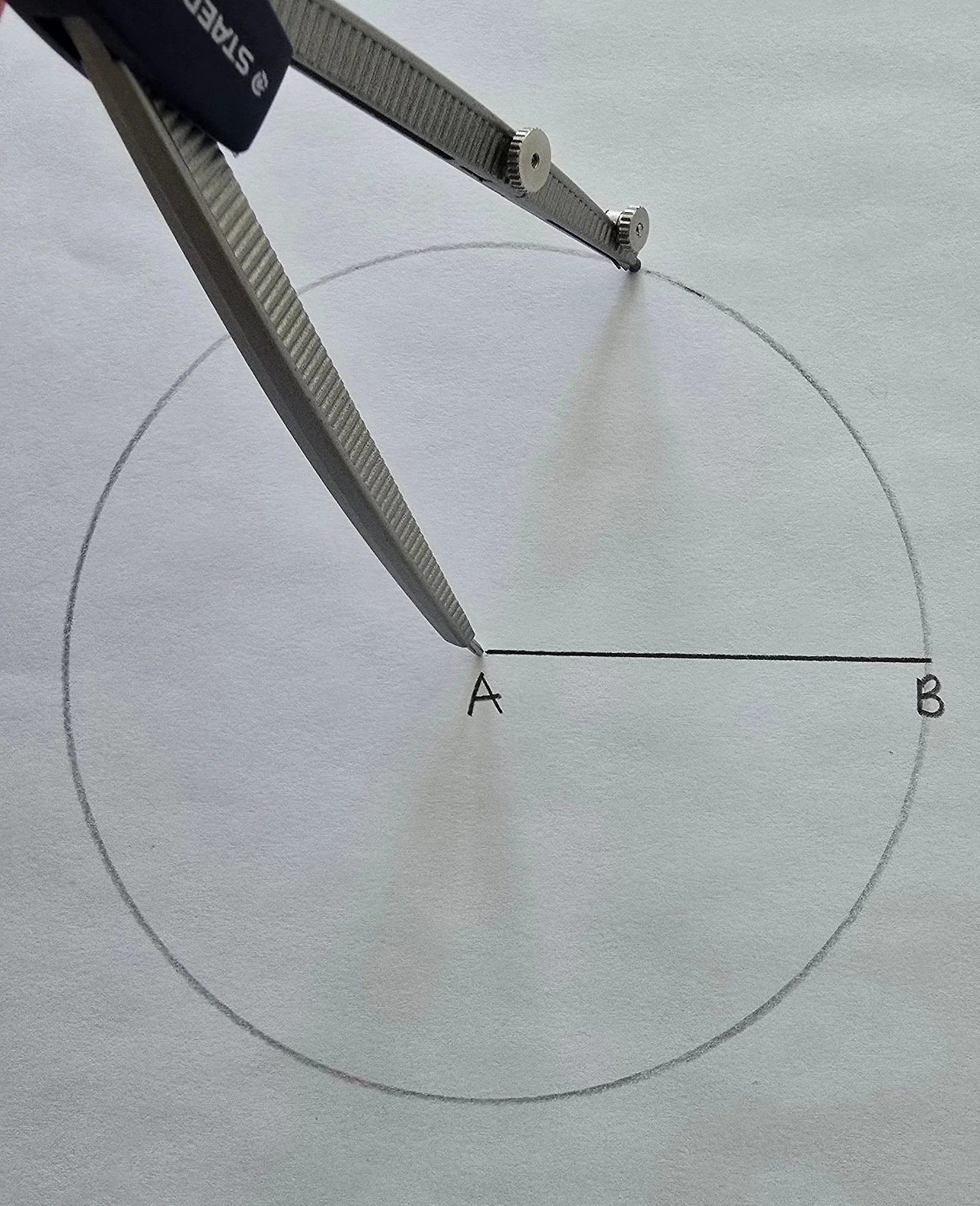 점 A에 컴퍼스의 중심축 바늘을 두고 점 B까지 폭을 벌립니다.