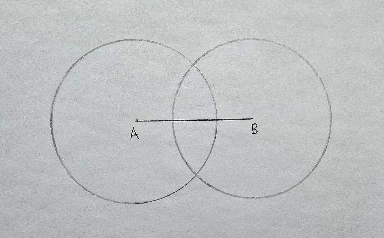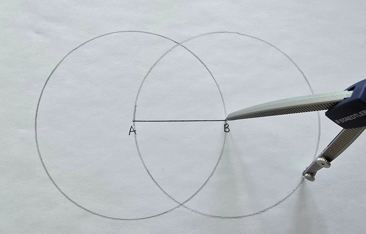 컴퍼스의 폭을 그대로 유지하면서 이번엔 점 B를 중심으로 원을 그려주세요.