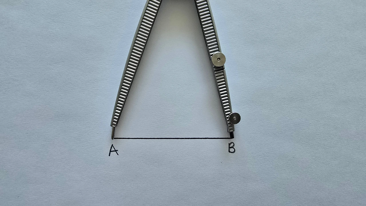 주어진 선분 AB를 한 변으로 하는 정삼각형을 그릴 거예요. 정삼각형은 세 변의 길이가 같아야 하니까 선분 AB의 길이와 나머지 두변을 같은 길이로 그려주면 끝. 근데 자에 눈금이 없는데 어떻게 똑같이 그리죠? 그럴 때 사용하는 물건이 바로 '컴퍼스'입니다. 컴퍼스로는 선분을 복사할 수 있거든요.