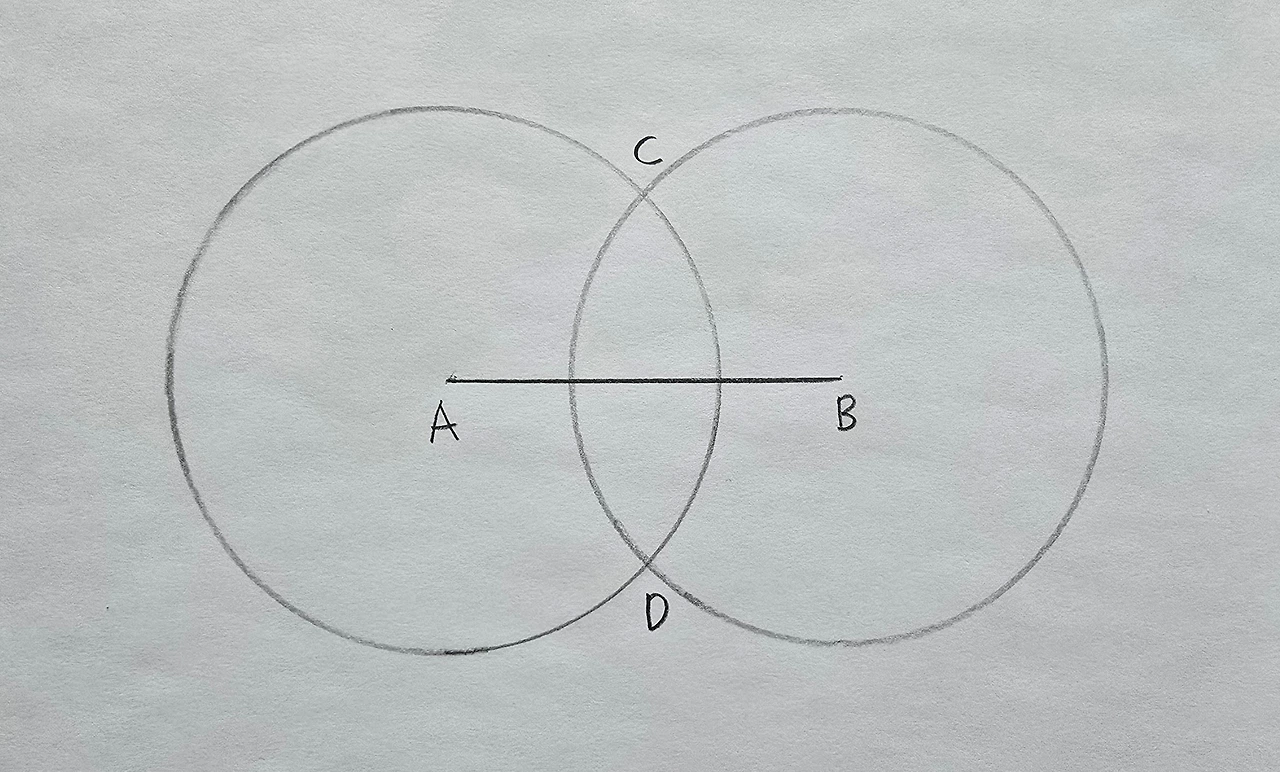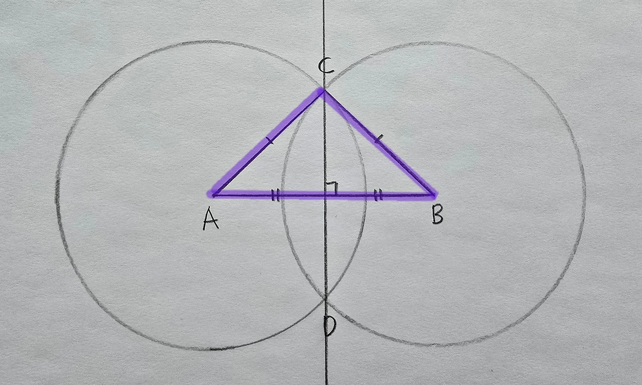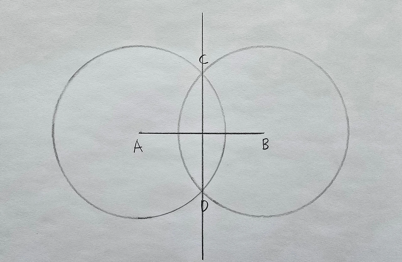 점 A, 점 B, 점 C를 이어서 삼각형을 만들어볼게요. 삼각형 ABC는 변 AC와 변 BC의 길이가 같은 이등변삼각형입니다. 둘 다 크기가 같은 두 원의 반지름이니까요. 삼각형 ABC가 이등변삼각형이므로 선분 AB와 직선 CD는 수직관계가 확실합니다. 이등변삼각형 꼭지각의 이등분선이 밑변을 '수직이등분'한다는 성질을 이용했어요.각도기 없이 직각을 그리는 획기적인 방법입니다.