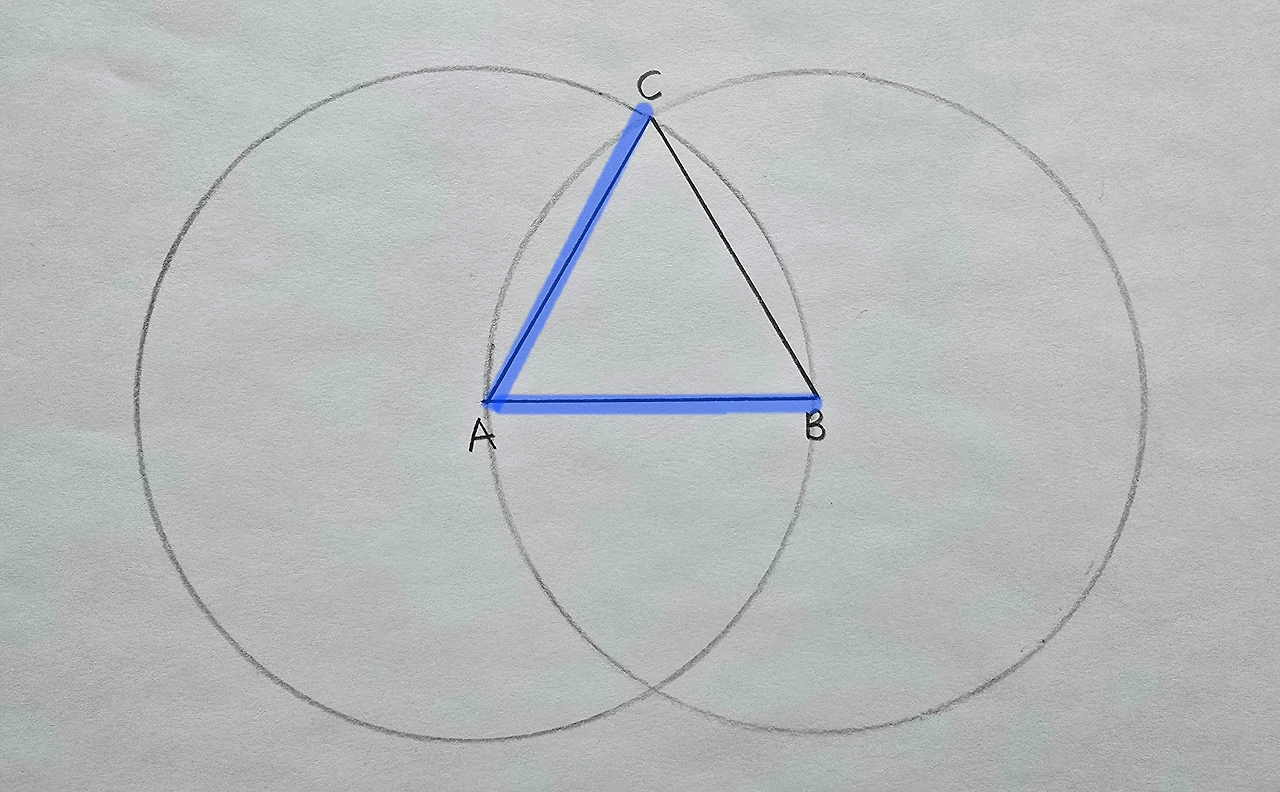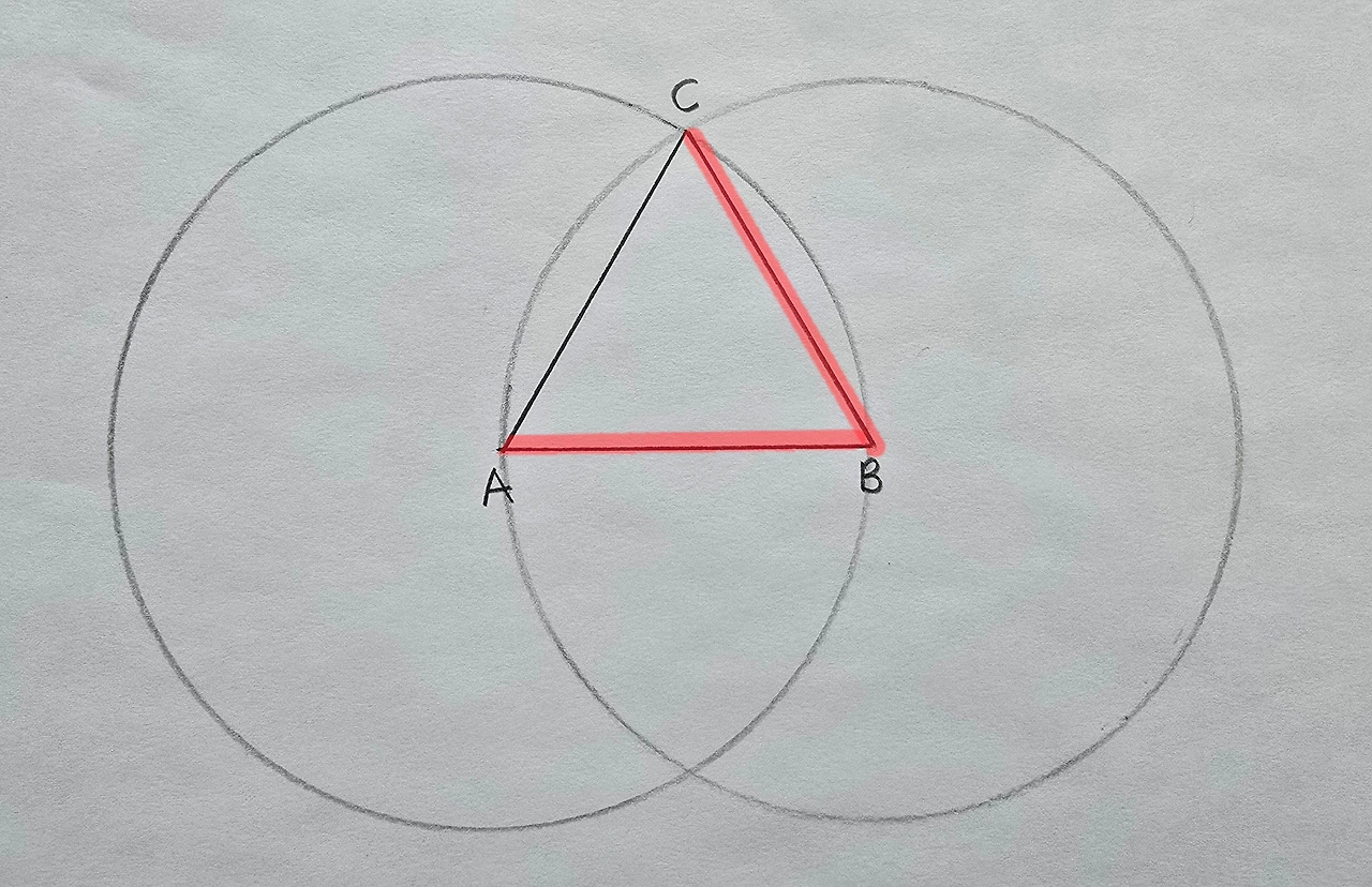자 보세요. 우리가 세 변의 길이가 같은 정삼각형을 작도했어요.