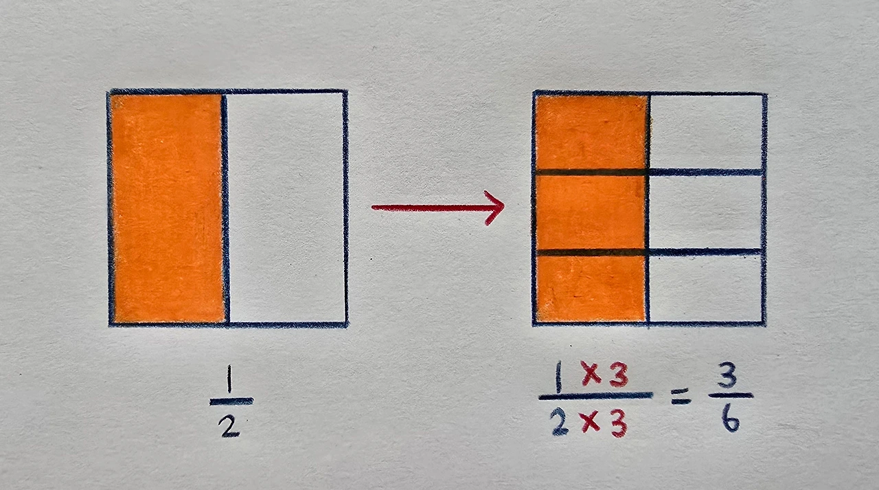 분수의 성질을 이용해서, ½ 의 분자와 분모에 똑같이 3을 곱