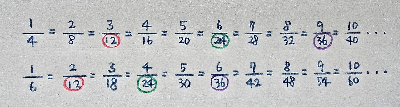 ¼과 이 분모가 같을 때는 분모가 12, 24, 36... 일 때에요. 통분모가 될 수 있는 수는 수 없이 많습니다. 큰 수를 공통분모로 삼는다고 해서 틀린 건 아니에요. 다만 산하는 사자가 번거로울 뿐이죠. 수가 커지면 중간에 연산 실수하기도 쉽고 마지막에는 약분도 해줘야 하니까요. 가급적 작은 수로 통분하는 게 효율적인 방법입니다. 그 작은 수가 뭐냐? 바로 두 분모의 '최소공배수'입니다. 배수, 즉 공통된 배수 중에서 가장 작은 수를 최소공배수라고 해요. 두 수의 공배수는 끝이 없어요. 영원히 계속됩니다. 그래서 가장 작은 수인 최소공배수를 공통분모로 만드는 게 가장 가성비가 좋니다.