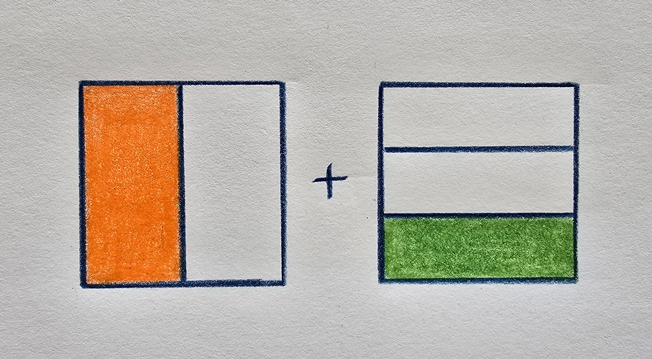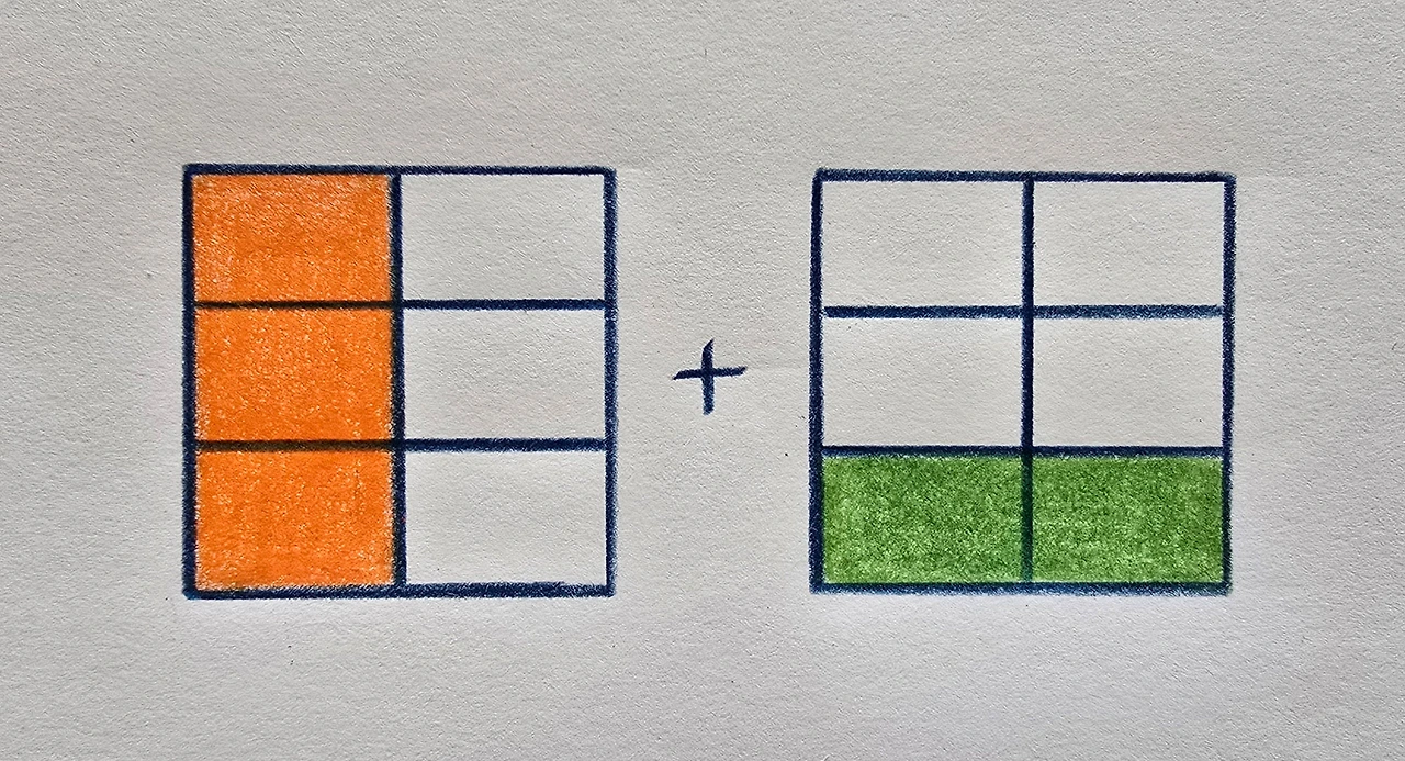 그랬더니 분모가 6으로 같아졌습니다. 두 분수의 단위분수가 ⅙이 됐으니 덧셈이 가능합니다. 그런데 ½과 ⅓의 공통분모를 왜 하필이면 6으로 맞춘 걸까요? 다른 수는 안 되나요? 혹시 분모끼리 서로 곱해준 거예요? 2×3=6? 그럼 이번에도 분모끼리 곱해서 공통분모를 만들어 보겠습니다.