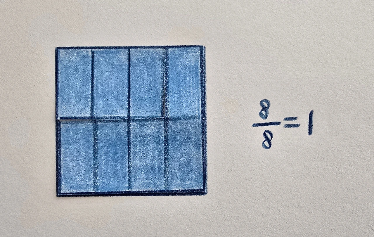 그래서 ⅜과 ⅝를 더하는 것은 ⅛ 3개와 ⅛ 5개를 더하는 것과 같아요. ⅛이 8개니까 이것은 8/8 즉 1입니다.