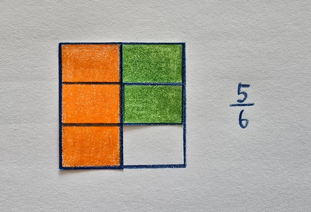 이젠 더할 수 있겠지요? 분수의 크기는 그대로인데 단위분수가 순식간에 같아졌어요. ½은 ⅙이 3개이고 ⅓은 ⅙이 2개니까 ⅙은 모두 5개. 그래서 ½+⅓=⅚입니다.