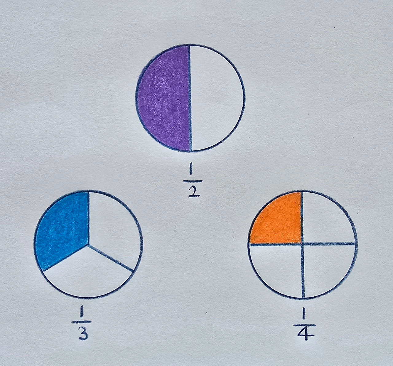 빵 하나를 똑같이 두 조각으로 나누면 그중 한 조각의 크기는 ½, 같이 세 조각으로 나누면 그중 한 조각의 크기는 ⅓, 똑같이 네 조각으로 나누면 그중 한 조각의 크기는 ¼ 이에요. ½, ⅓, ¼...처럼 분자가 1인 분수 바로 '단위분수'입니다. 이러한 단위분수가 분수를 세는 기준 됩니다.
