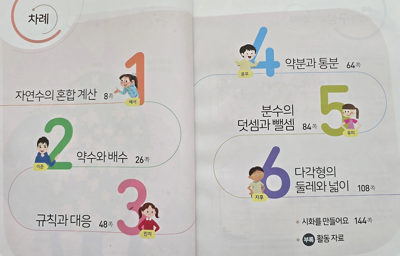 초등학교 5학년 1학기 수학책을 보면 2단원에서 [약수와 배수]를 먼저 배우고, 4단원 [약분과 통분]을 배운 후, 5단원에서 [분모가 다른 분수의 덧셈과 뺄셈]을 배워요. 분수로 가기 위해 개념을 차곡차곡 다져갑니다.
