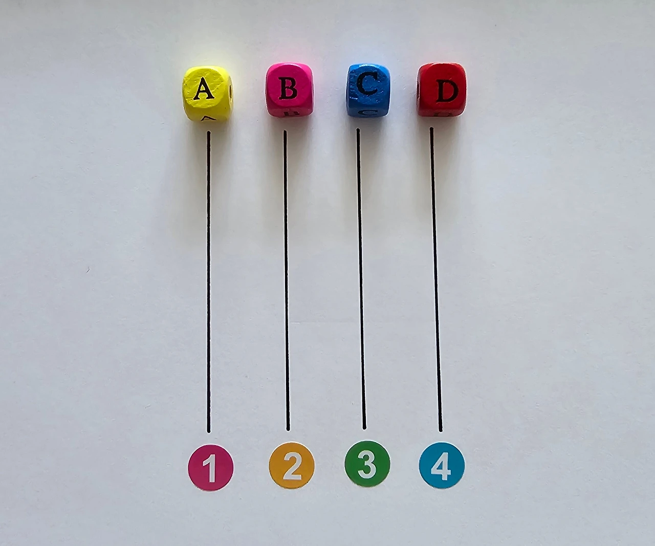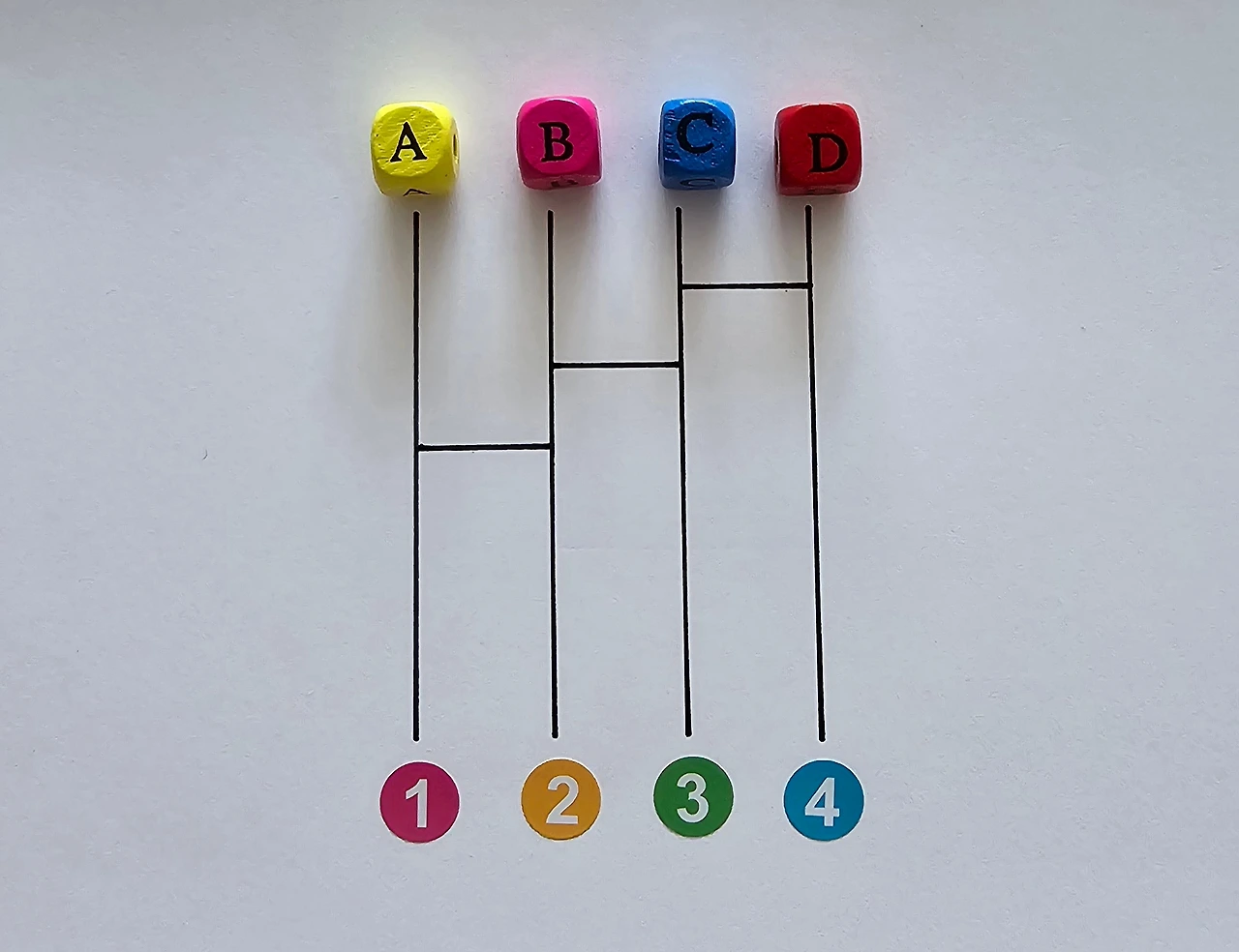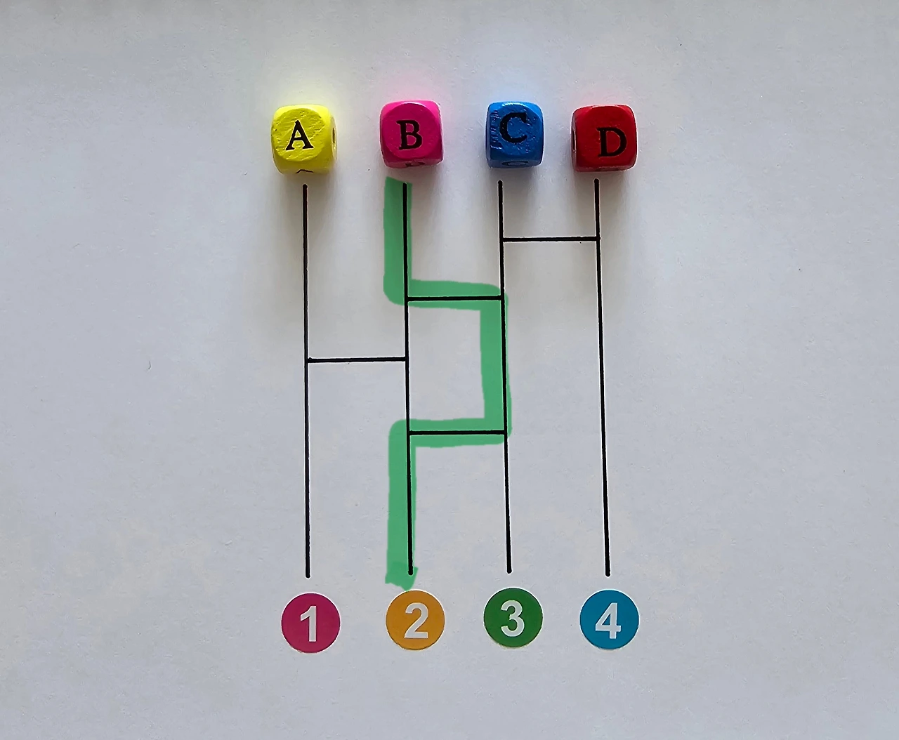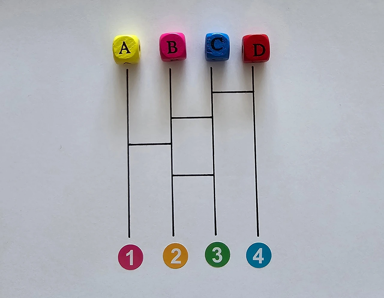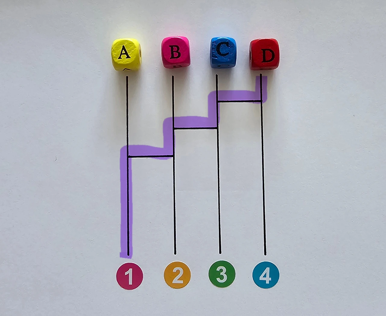 직접 실험해 봅시다. 이번엔 네 명이 사다리타기 게임으로 1,2,3,4등 자리를 뽑는 상황이에요.