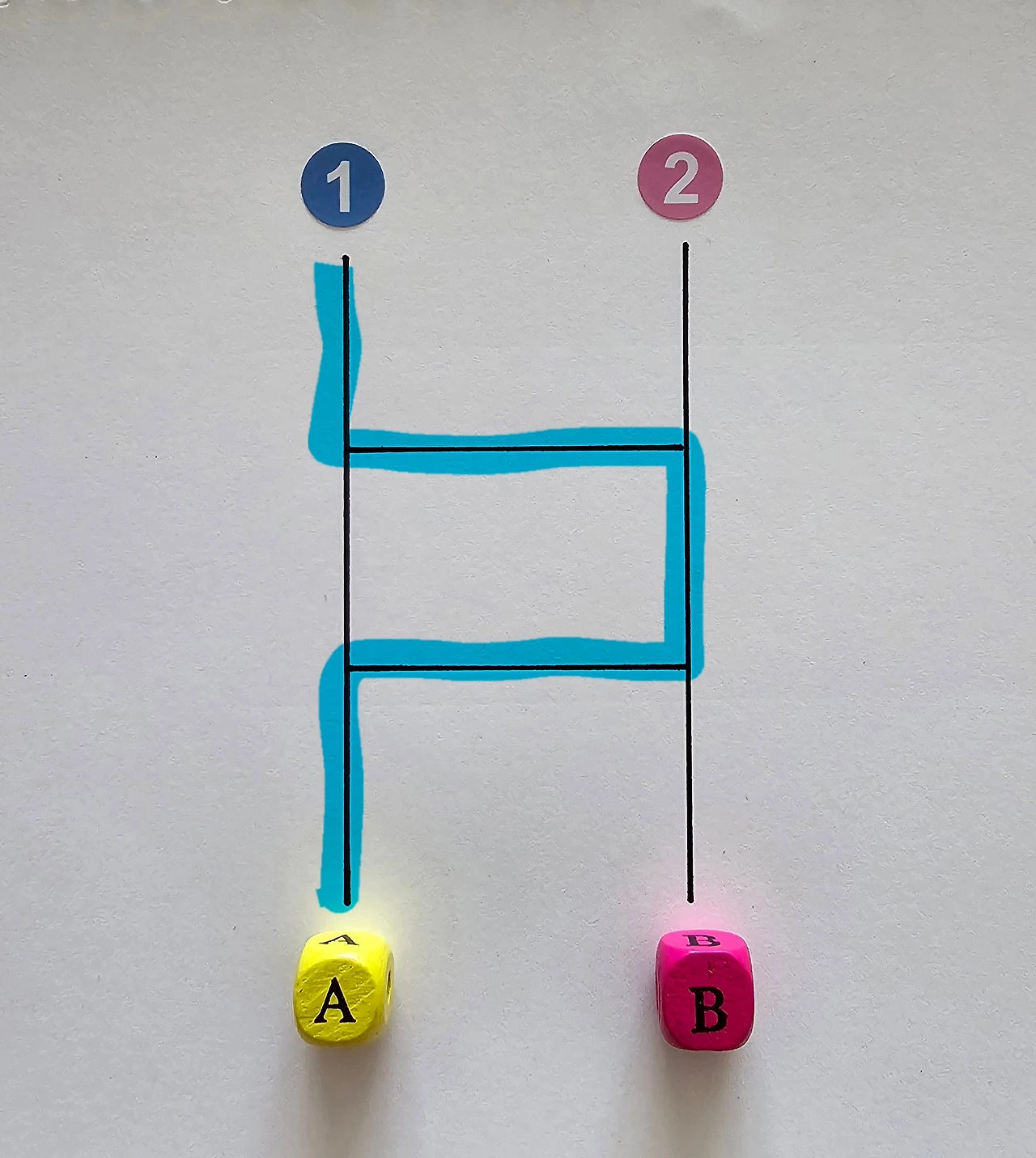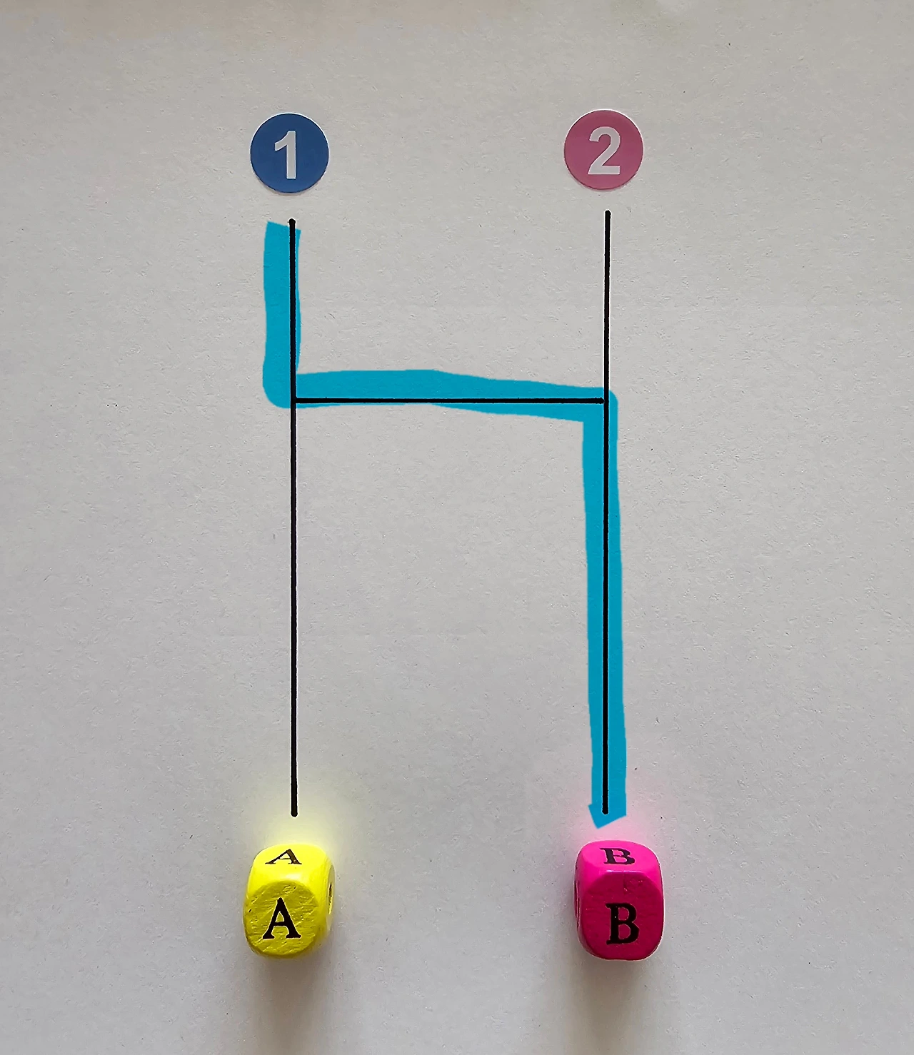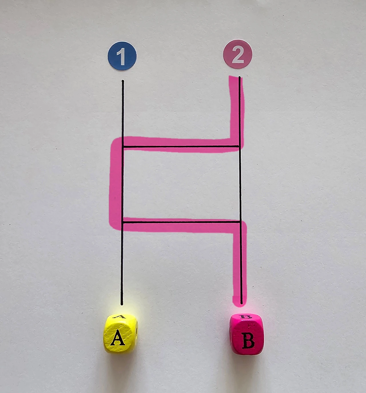 참가자가 2명이니까 선도 2개 그었어요. 사다리가 아니라 밧줄이군요. 각자의 줄을 따라가면 당연하게도 자기 줄 아래에 도착해요. 1은 A로, 2는 B로 말이죠. 하나당 하나씩인 '일대응대응'이 일어납니다.