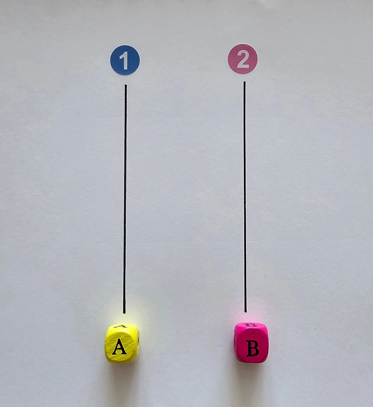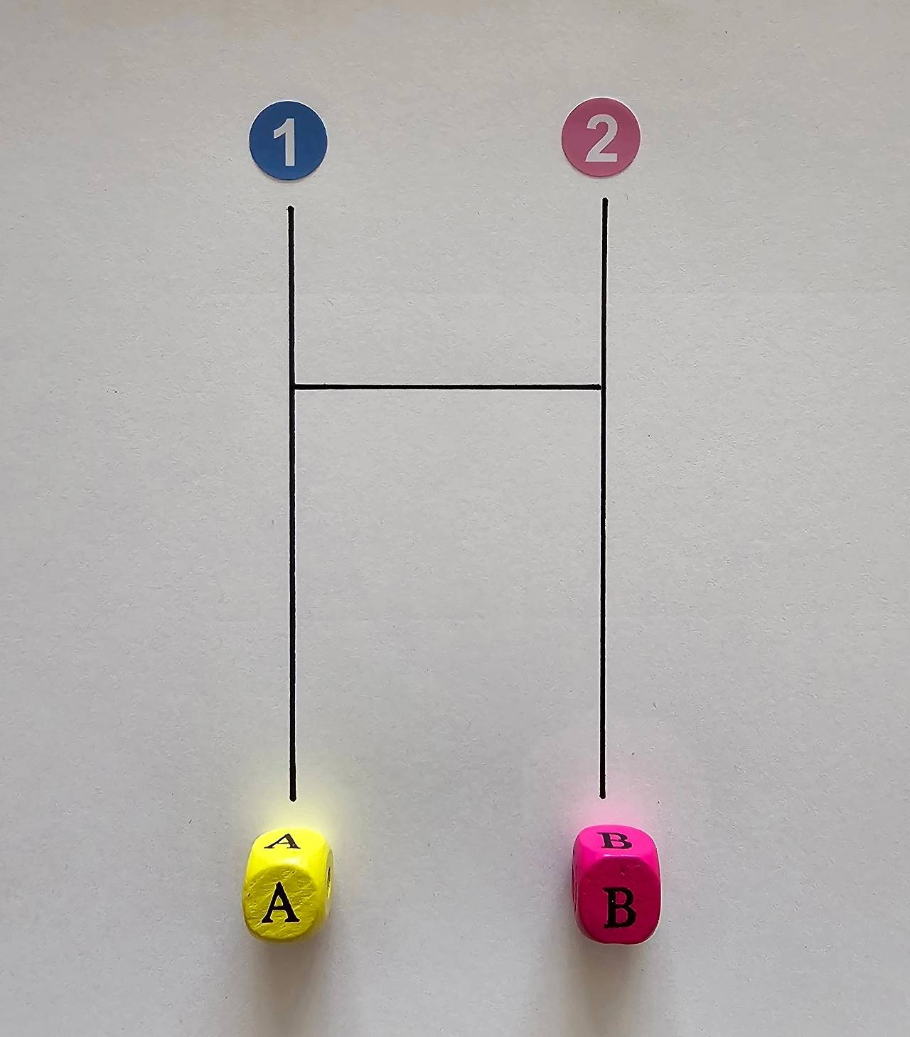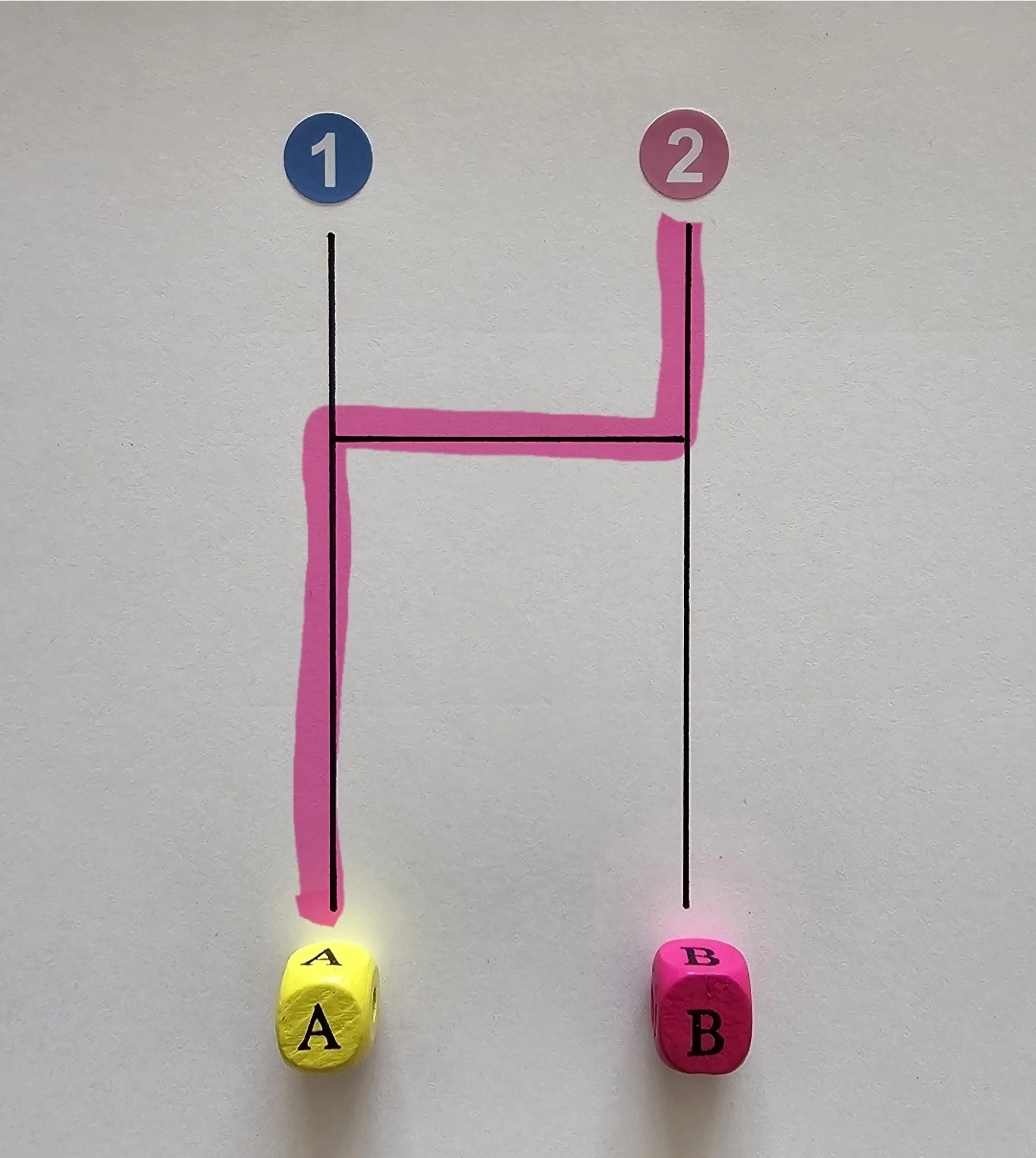 참가자가 2명이니까 선도 2개 그었어요. 사다리가 아니라 밧줄이군요. 각자의 줄을 따라가면 당연하게도 자기 줄 아래에 도착해요. 1은 A로, 2는 B로 말이죠. 하나당 하나씩인 '일대응대응'이 일어납니다.
