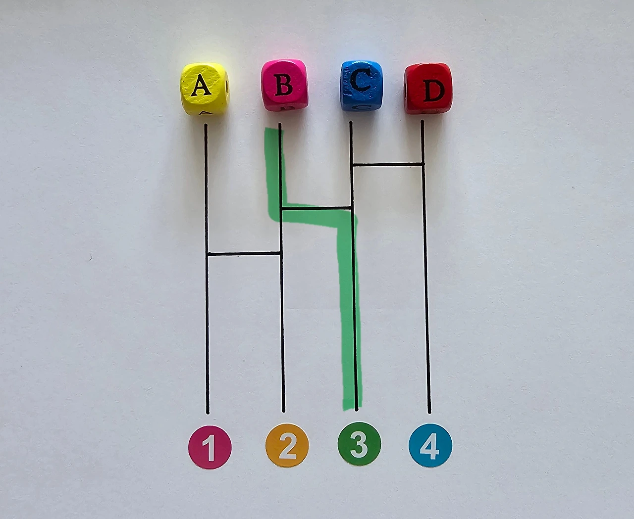 원래대로라면 D는 영락없는 4등이죠. 근데 1등을 하고 싶대요.D가 1등 자리로 가려면 옆으로 세 번 옮겨가야 하니까 가로선을 3개 긋습니다. 오르락내리락해서는 안 되고 순차적으로 내려가게끔 세 줄을 그려요.