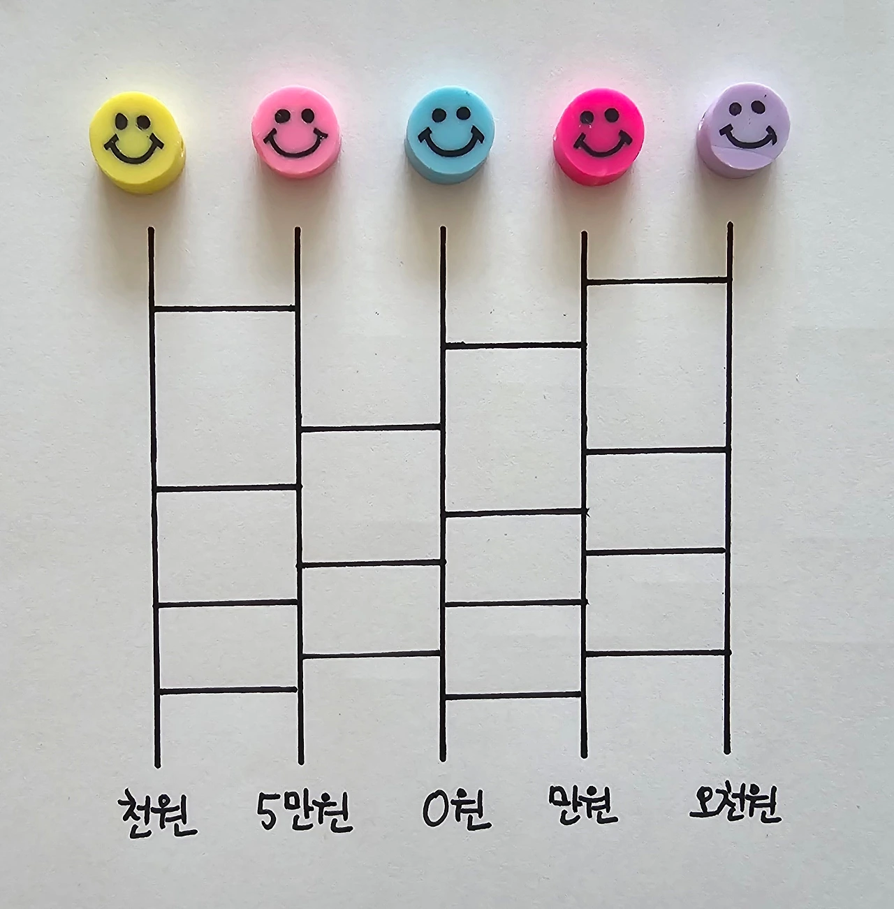 완성됐으면 사다리 부분을 가리고 각자 한 개씩 선택합니다. 사다리를 타고 내려가서 결과를 확인하면 끝.