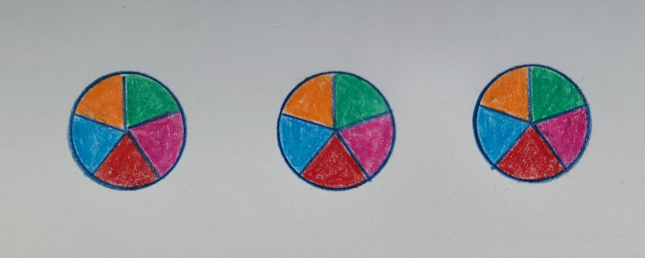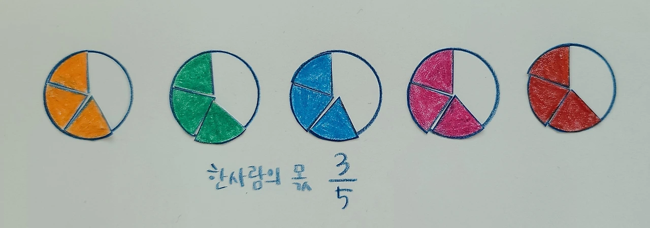 빵 3개를 각각 5등분해서 나눠가지면, 한 사람의 몫은 ⅗이 됩니다.