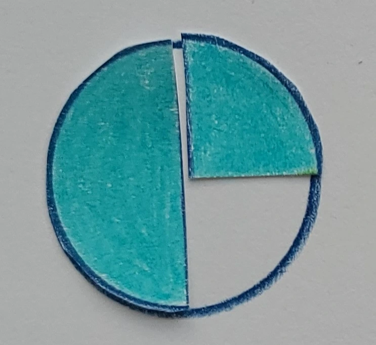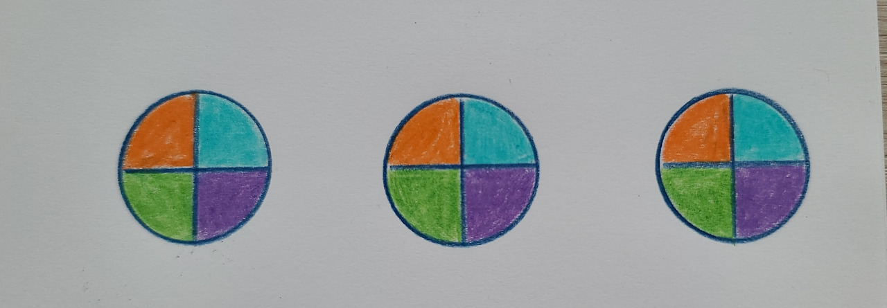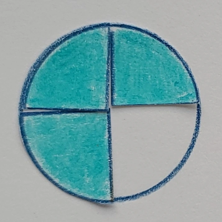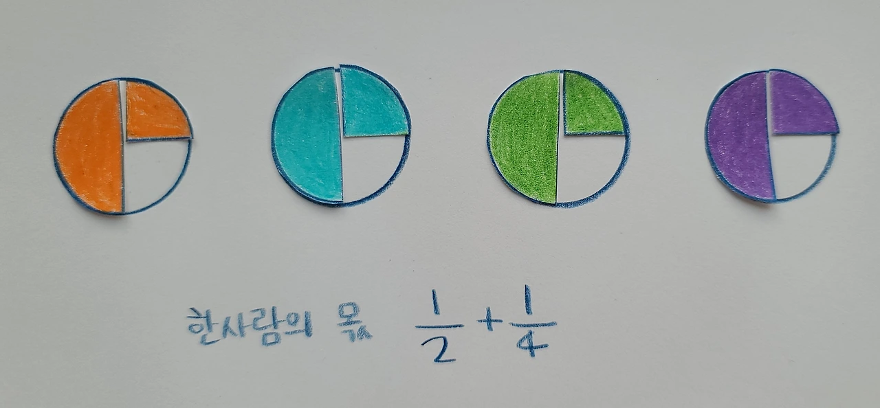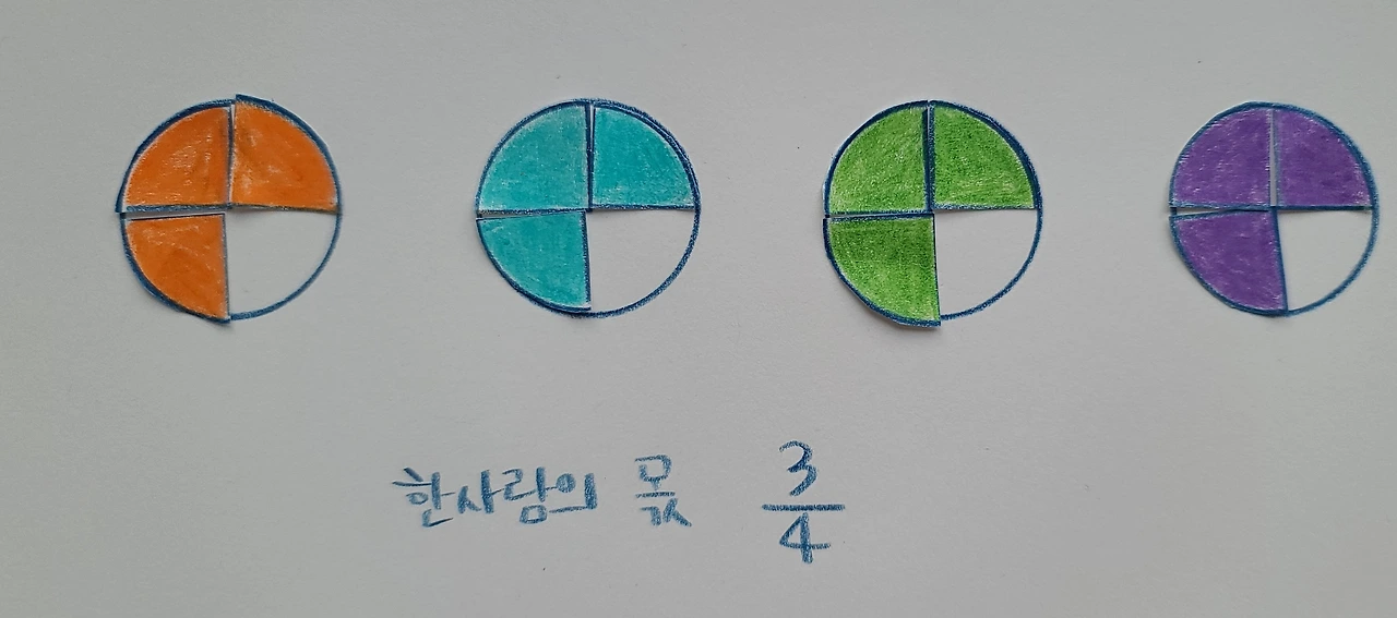 그럼 한 사람당 ¼+¼+¼을 가져갈 수 있습니다. 이것을 다 더하면 ¾을 가져갈 수 있겠죠. 한사람이 가져가는 몫은 바로 이만큼입니다.