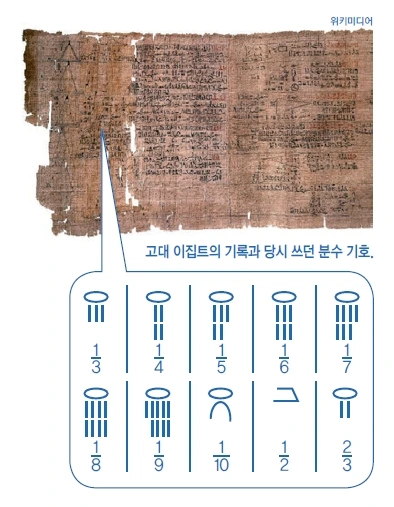 이런 모양입니다. 분모 위에 있는 타원이 '분자가 1'임을 나타내는 기호입니다. 지금의 분수로 치자면 '단위분수'만 존재했어요. 단위분수란, 분자가 1인 분수를 말합니다. ½,⅓,¼,⅛... 이런 분수가 단위분수인데, 이집트에서는 이 단위분수를 이용해서 분배 문제를 해결했습니다. 예외적으로 ⅔도 사용했는데 그 이유는 알려져있지 않아요.