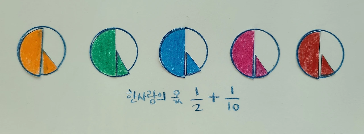 그러면 한 사람이 가져갈 몫은 1/2+1/10이 됩니다.이것은 앞선 방법으로 구한 3/5와 같은 양입니다.