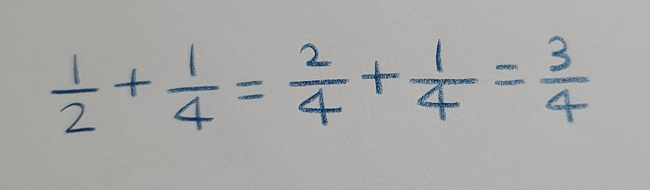 ½+¼ 과 ¾은 같은 수입니다. 정말 같은지 의심스럽다면 우리가 배운 방식대로 통분을 해서 더해봅시다.