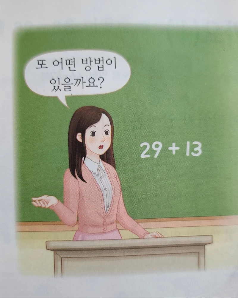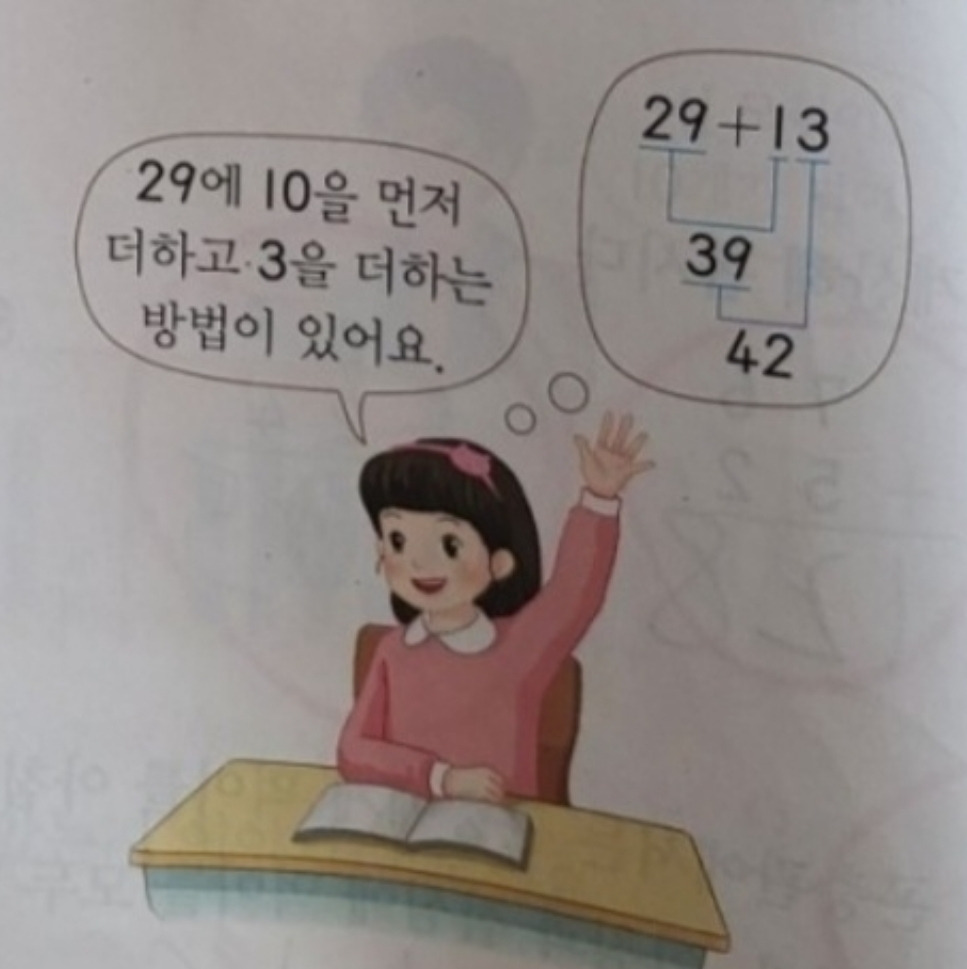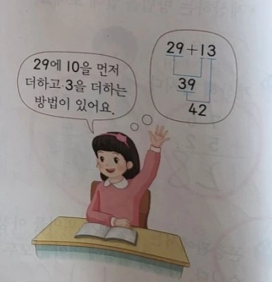 교과서에는 예시로, 29+10을 먼저 하고 거기에 3을 더하는 방법이 소개되어 있습니다.