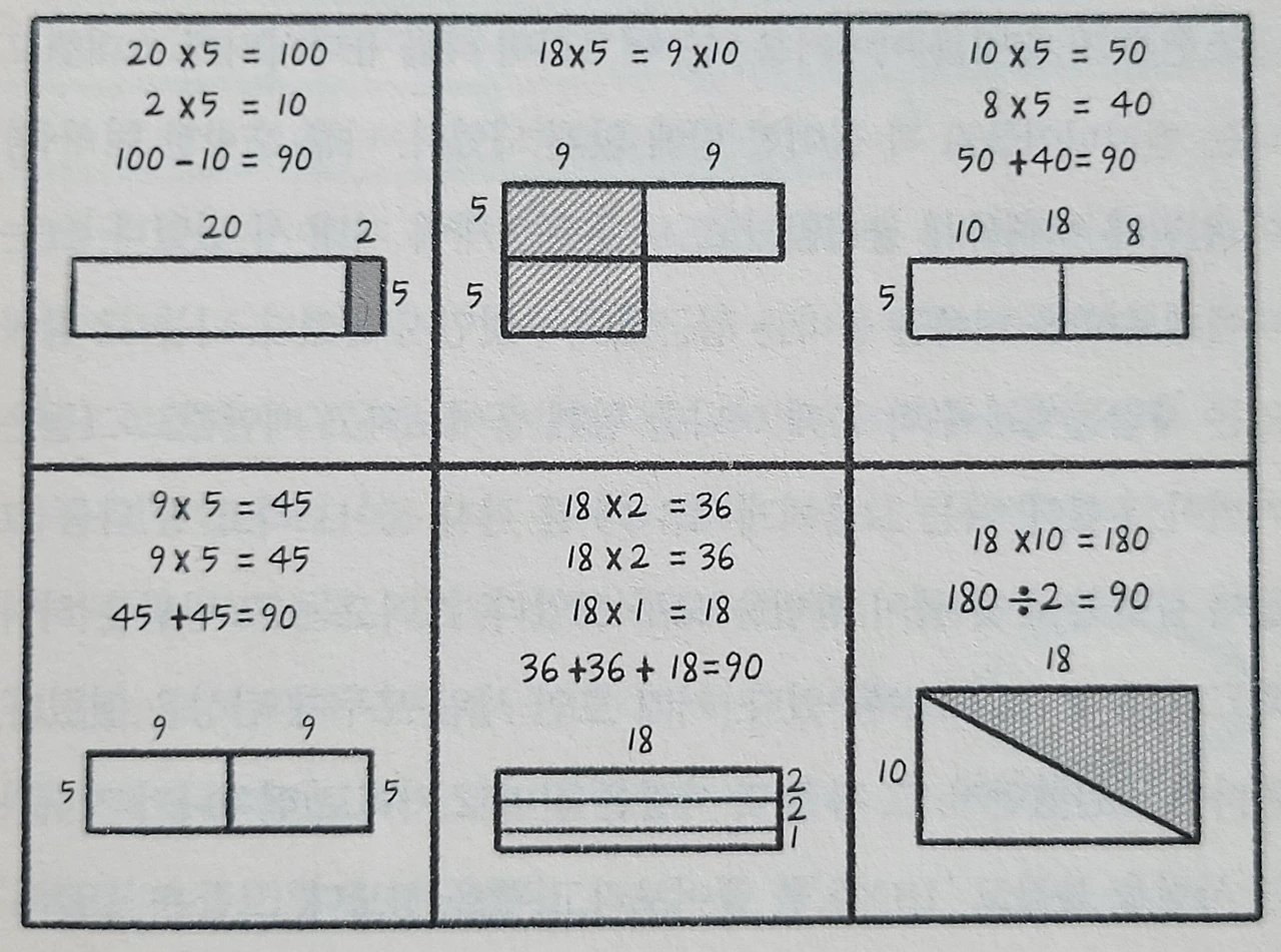 그런데 방법은 이뿐만이 아니에요. 18×5에도 다양한 풀이법이 있습니다. 한번 보실래요?