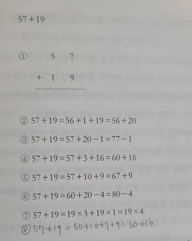 57+19를 푸는 방법도 이렇게 다양합니다. 이 방법을 다 암기하는 게 목적이 아니에요. 쉽고 빠른 나만의 방법대로 풀면 됩니다. 단, 내가 갖고 있는 무기가 하나라면 어떤 전투에서건 그 무기 하나로만 싸워야 하지만, 소유한 무기가 여러 개라면 매 상황마다 최적의 무기를 내맘대로 골라 쓸 수 있어요.