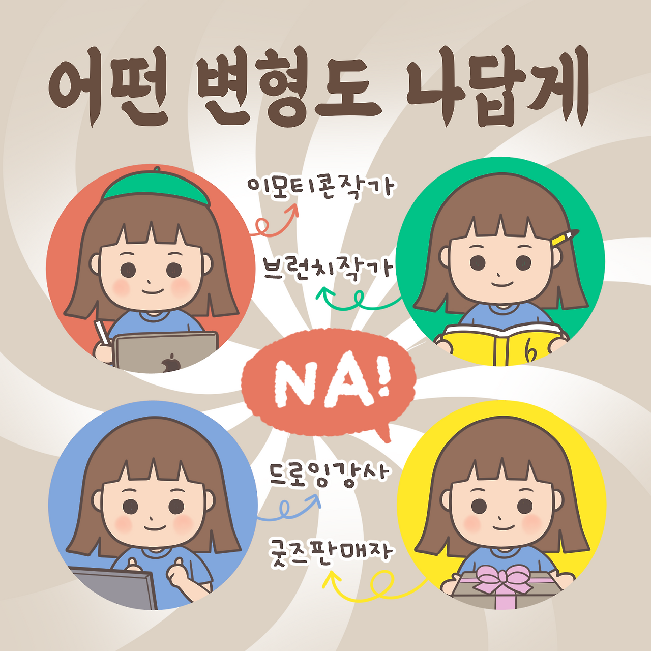 이제는 모든 변화에 조금씩 나를 중심에 두고 확장 변형되는 삶을 살아가고 있다. 이모티콘 작가, 드로잉 강사, 브런치 작가, 전자책 판매, 굿즈 판매 등등 내가 중심에 이니 어떤 형태의 변형도 나답게 변화할 수 있다. 한 우물만 파던 고립된 웹디자이너에서 다양한 일을 하는 N 잡러 가 되어, 새로운 일을 할 때 행복한 긴장감에 비명을 지르기도 하지만, 가슴 뛰는 일을 하는 순간, 살아있음을 느끼게 된다. 어떤 위기의 순간에도 다시는 나를 먼저 포기하지 않겠다는 마음을 가지고 오늘도 내가 할 수 있는 일에 최선을 다하기로 했다.