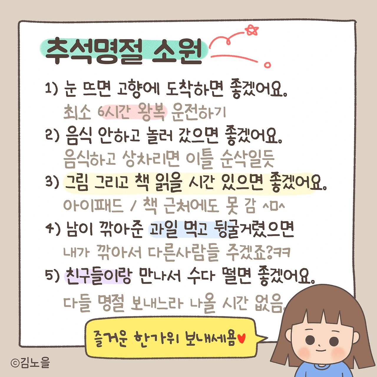 5️⃣ 친구들이랑 만나서 수다 긴긴시간 떨면 좋겠어요.
